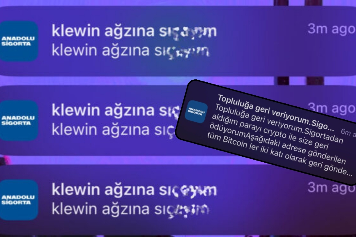 Anadolu Sigorta uygulaması üzerinden dün gece kullanıcılara argo içerikli bildirimler gönderildi. Buna ek olarak dolandırıcılar tarafından bildirim sistemi üstünden kripto para dolandırıcılığı yapılmaya çalışıldı.