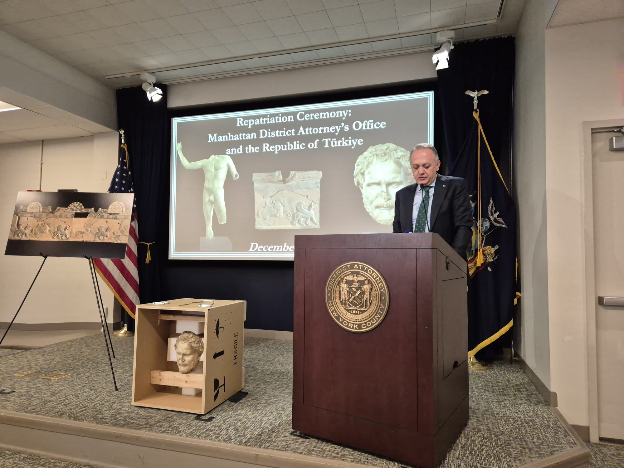 “Boubon kökenli anıtsal bronz İmparator Heykeli, Roma dönemine ait Demosthenes portresi ile Urartu ve Lidya uygarlıklarına ait eserlerin de aralarında bulunduğu kültür varlıklarımız New York’tan Türkiye’ye uzanan yolculuğunu tamamladı.