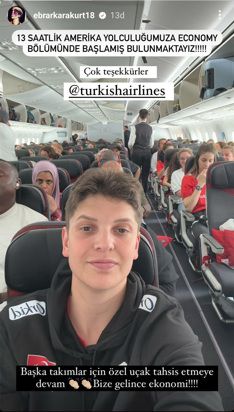 Turnuvalara katılmak için geçtiğimiz günlerde ABD’ye giden A Milli Kadın Voleybol Takımı oyuncularının THY’ye ait uçakta ekonomi sınıfı uçurulması büyük tartışma yaratmıştı. Takım oyuncularından Ebrar Karakurt sosyal medyasından, takımın 13 saatlik yolculukta ekonomi sınıfında uçurulmalarına tepki göstererek, “Başka takımlar için özel uçak tahsis etmeye devam, bize gelince ekonomi” paylaşımdan sonra özellikle sosyal medyada THY’ye ve Voleybol Federasyonu’na tepkiler yağmıştı. THY yönetimi konuyla ilgili açıklama yaparak kendilerinin haberi olmadığını belirtmiş ve kadın sporcuların bundan sonra Business’ta uçmalarının sağlanacağını açıklamıştı.
