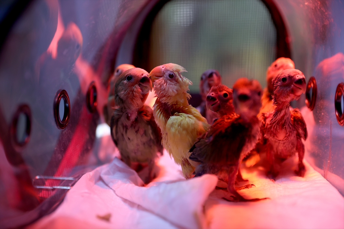 Antalya'da belgesiz bir şekilde satılmaya çalışıldığı için el konulan cennet papağanı yavrularına Antalya Doğal Yaşam Parkı'nda veteriner hekimler tarafından özenle bakılıyor.
