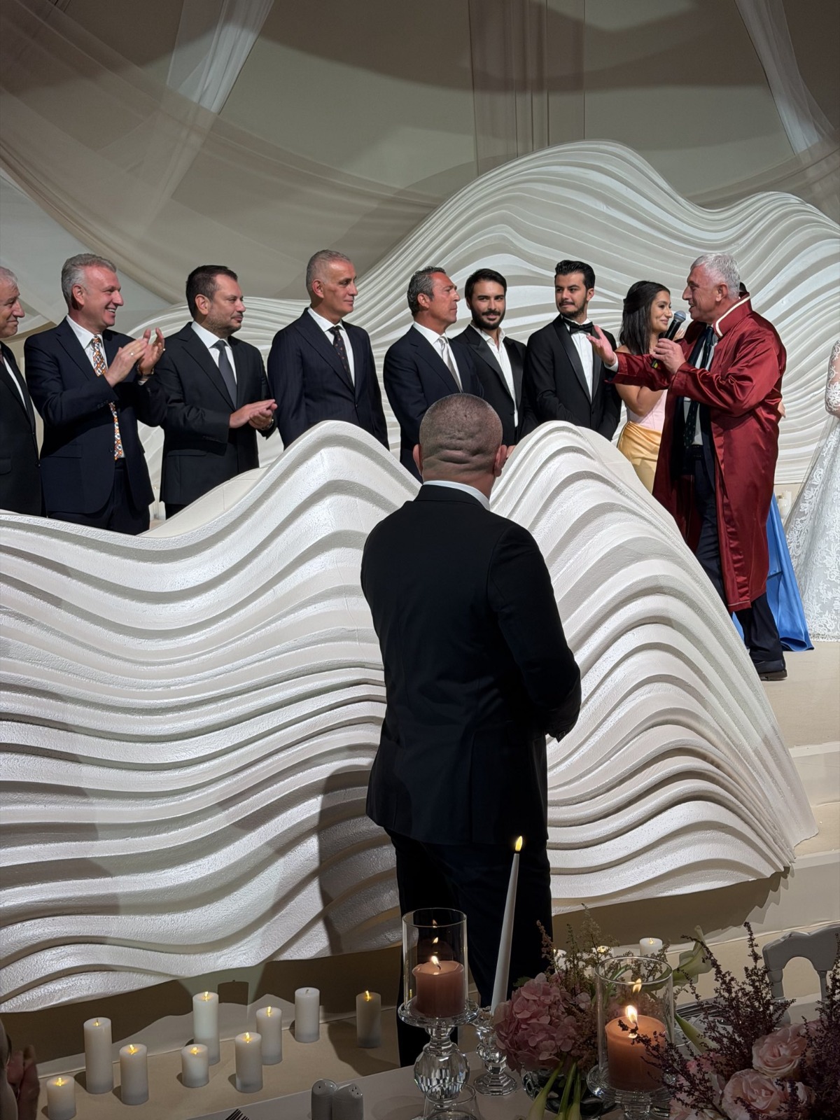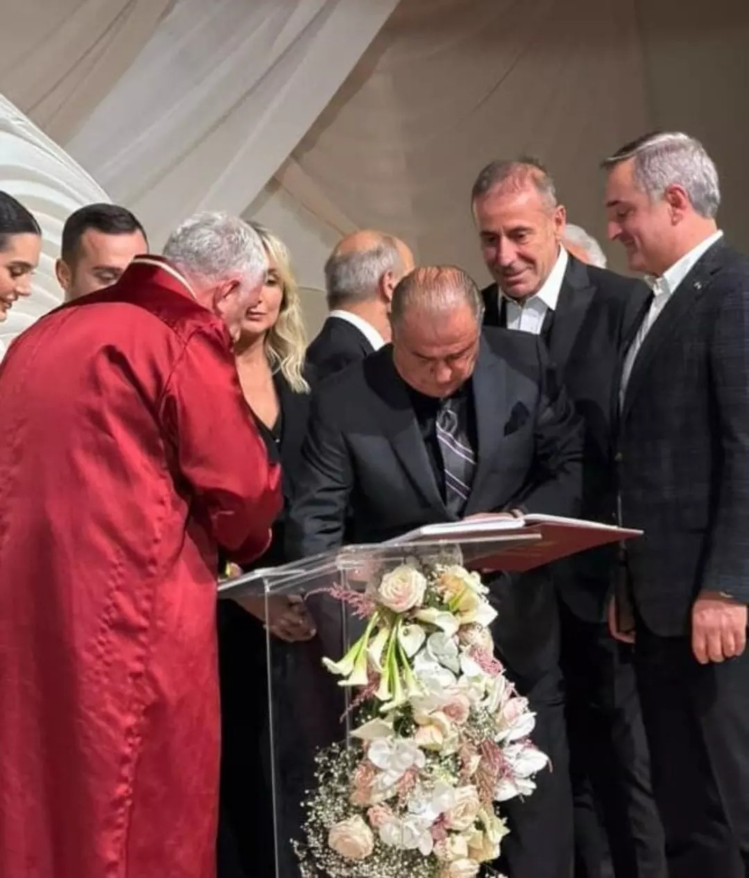 Türk futbolunun simge isimlerinden teknik direktör Fatih Terim, törende nikah şahidi olarak yer aldı. Genç çiftin evliliklerine şahitlik eden Terim, salondaki davetlilerden büyük alkış aldı.