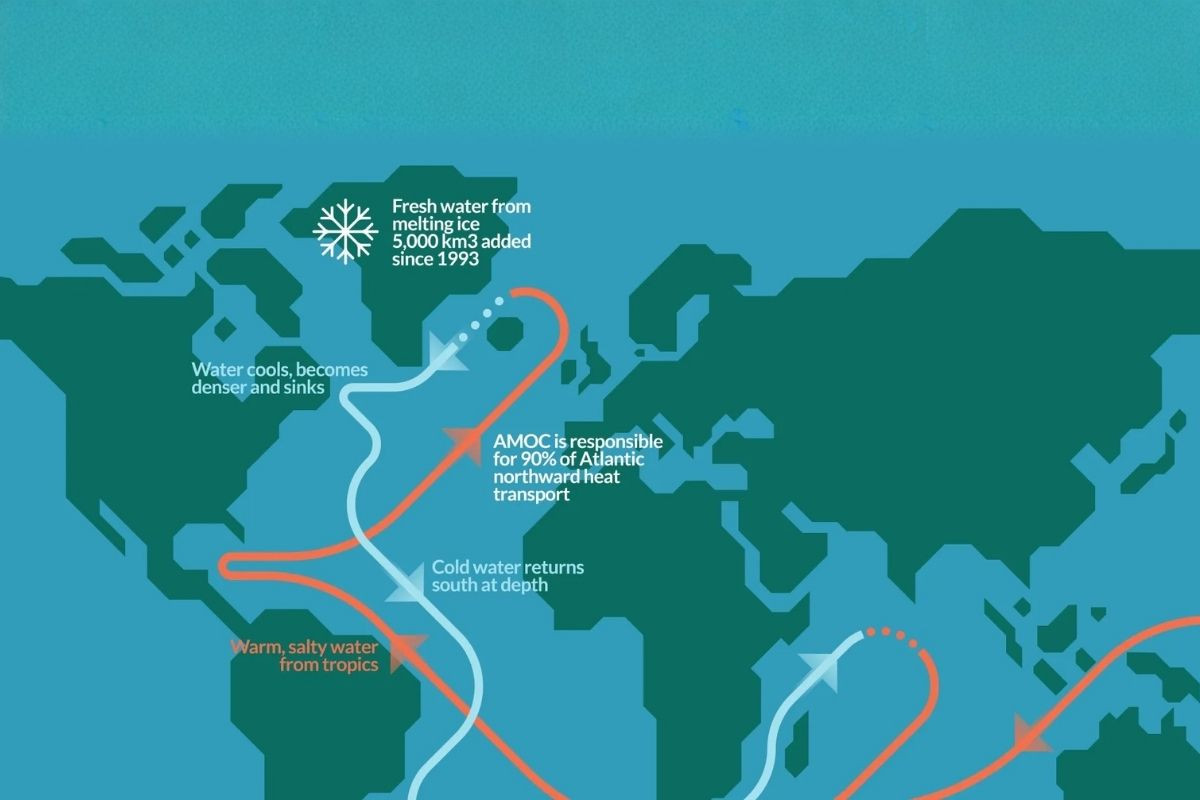 AMOC, küresel iklim sisteminin önemli bir parçası ve güneşle ısınan tropikal suları Avrupa ve Arktik'e taşıyor, burada sular soğuyarak batar ve derin bir geri dönüş akıntısı oluşturur. Bir çöküş, milyonlarca insanın gıda yetiştirmek için güvendiği tropikal yağış kuşağını değiştirecek, Batı Avrupa'yı aşırı soğuk kışlara ve yaz kuraklıklarına sürükleyecek ve Atlantik çevresindeki zaten yükselen deniz seviyelerine 50-100 cm daha ekleyecektir.