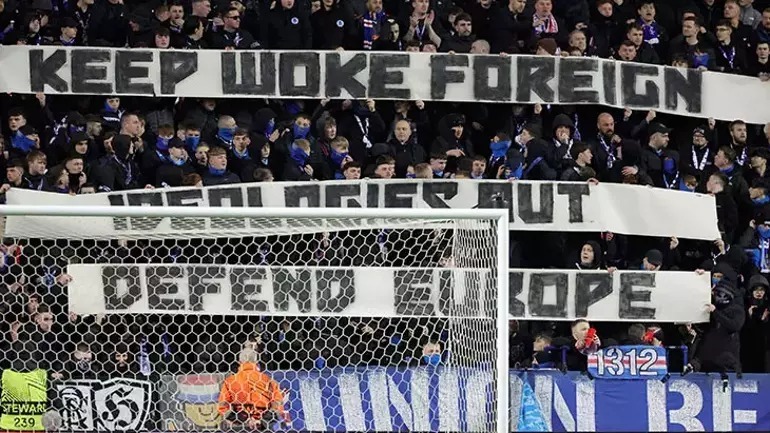 Rangers- Fenerbahçe maçında açılan pankart. Pankartta "Keep woke foreign ideologies out ‒ Defend Europe” (Uyanık yabancı ideolojileri dışarıda tut – Avrupa’yı savun) yazıyordu