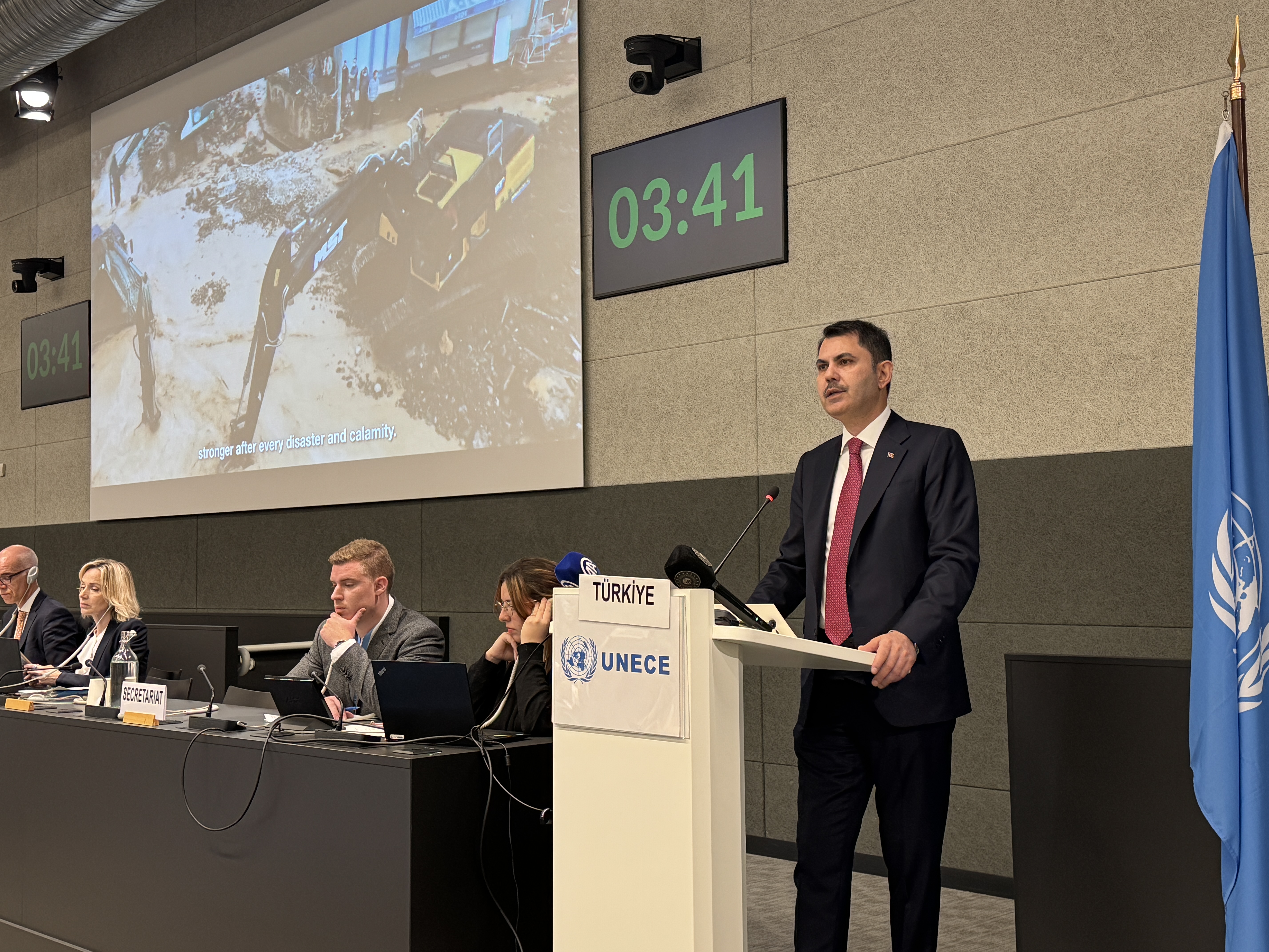 Çevre, Şehircilik ve İklim Değişikliği Bakanı Murat Kurum, Birleşmiş Milletler Avrupa Ekonomik Komisyonu'nun (BM AEK) Kentsel Kalkınma, Konut ve Arazi Yönetimi Komitesi'nin 86'ncı Oturumu kapsamında düzenlenen "Konut Uygunluğu ve Sürdürülebilirlik" başlıklı BM Cenevre Ofisi'nde düzenlenen toplantıda konuştu.