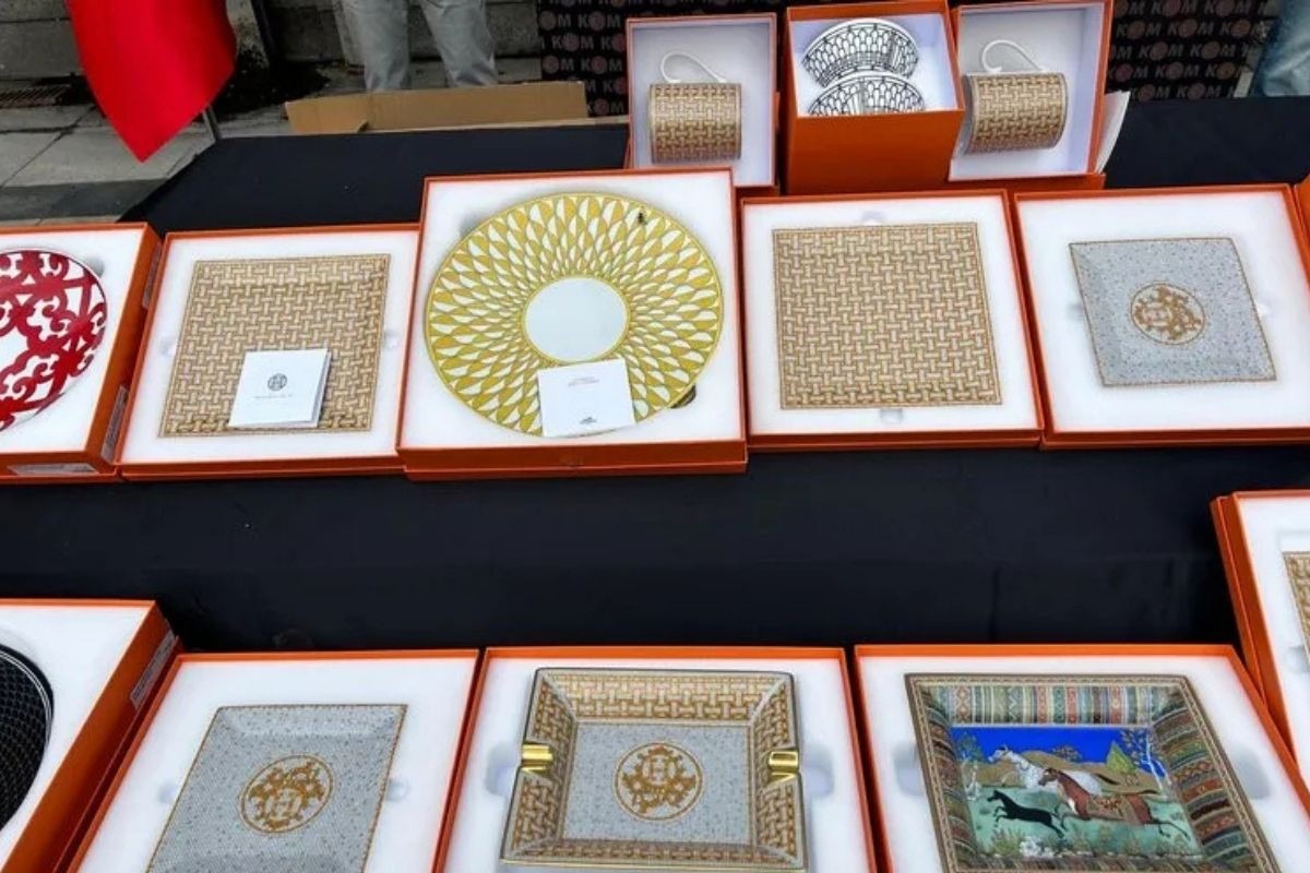 Emniyetin bahçesinde sergilenen özel tasarım eşyalar adeta lüks bir mezatı andırıyordu. Eşyaları sattıkları için ünlü çift gözaltına alındı.