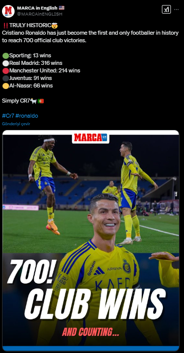 Suudi Pro Ligi’nde Al-Raed karşısında alınan 2-1’lik galibiyette bir gol atan ve bir asist yapan Ronaldo, kulüp kariyerinde 700. resmi galibiyetine ulaşarak bu başarıya erişen ‘ilk ve tek futbolcu’ oldu.