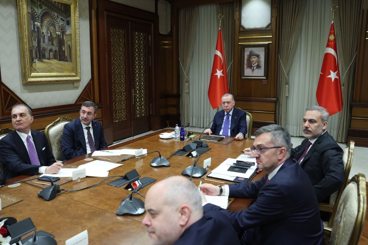 Toplantıda, Cumhurbaşkanı Yardımcısı Cevdet Yılmaz, Dışişleri Bakanı Hakan Fidan, Cumhurbaşkanlığı İletişim Başkanı Burhanettin Duran, Cumhurbaşkanı Dış Politika ve Güvenlik Başdanışmanı Akif Çağatay Kılıç, Cumhurbaşkanlığı Güvenlik ve Dış Politikalar Kurulu Başkanvekili Çağrı Erhan ve AK Parti Genel Başkan Yardımcısı ve Parti Sözcüsü Ömer Çelik de Cumhurbaşkanı Erdoğan'ın yanında hazır bulundu.