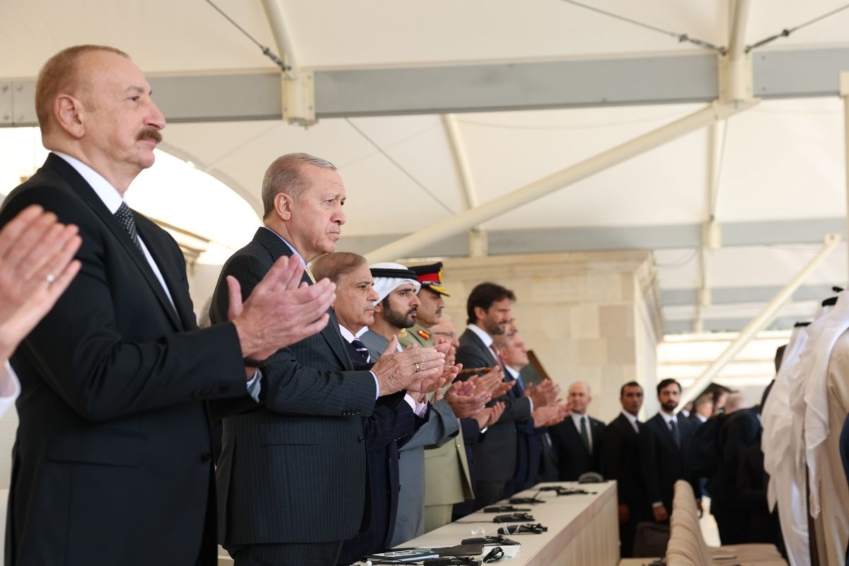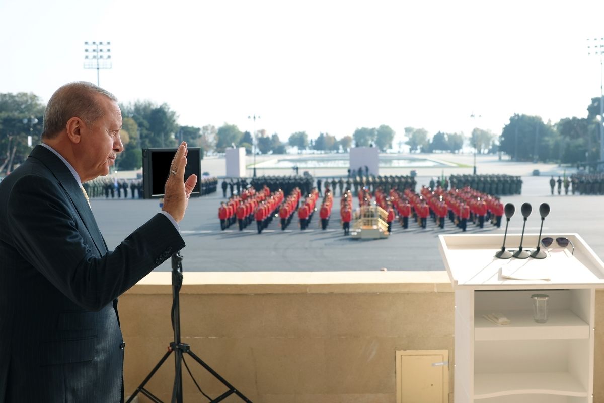 Aziz kardeşim Cumhurbaşkanı Sayın İlham Aliyev, Pakistan Başbakanı Sayın Şahbaz Şerif, Azerbaycan Silahlı Kuvvetleri’nin kahraman mensupları, Azerbaycanlı gardaşlarım, sizleri en kalbi duygularımla, saygıyla, sevgiyle selamlıyorum. Zafer günümüzün beşinci yıl dönümünde sizlerle beraber olmaktan büyük bir bahtiyarlık duyuyorum. İlham Aliyev kardeşim, nazik daveti için şükranlarımı sunuyorum. Sizlere, Türkiye’deki gardaşlarınızın selamlarını getirdim. Sizlere 86 milyonun en samimi muhabbetlerini getirdim.