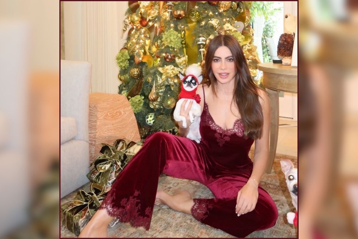 Sofia Vergara, kadife ve dantel pijamalarıyla köpekleriyle birlikte ağacın önünde poz verdi.