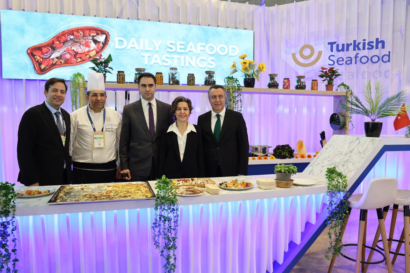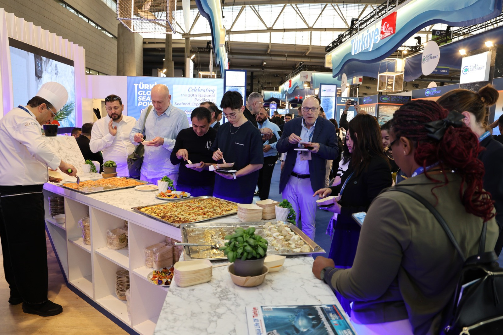 Türkiye standında sıra oluşan bölümlerden biri de Şef İbrahim Önen’in Türk su ürünleriyle yemek pişirdiği tadım alanı oldu.
