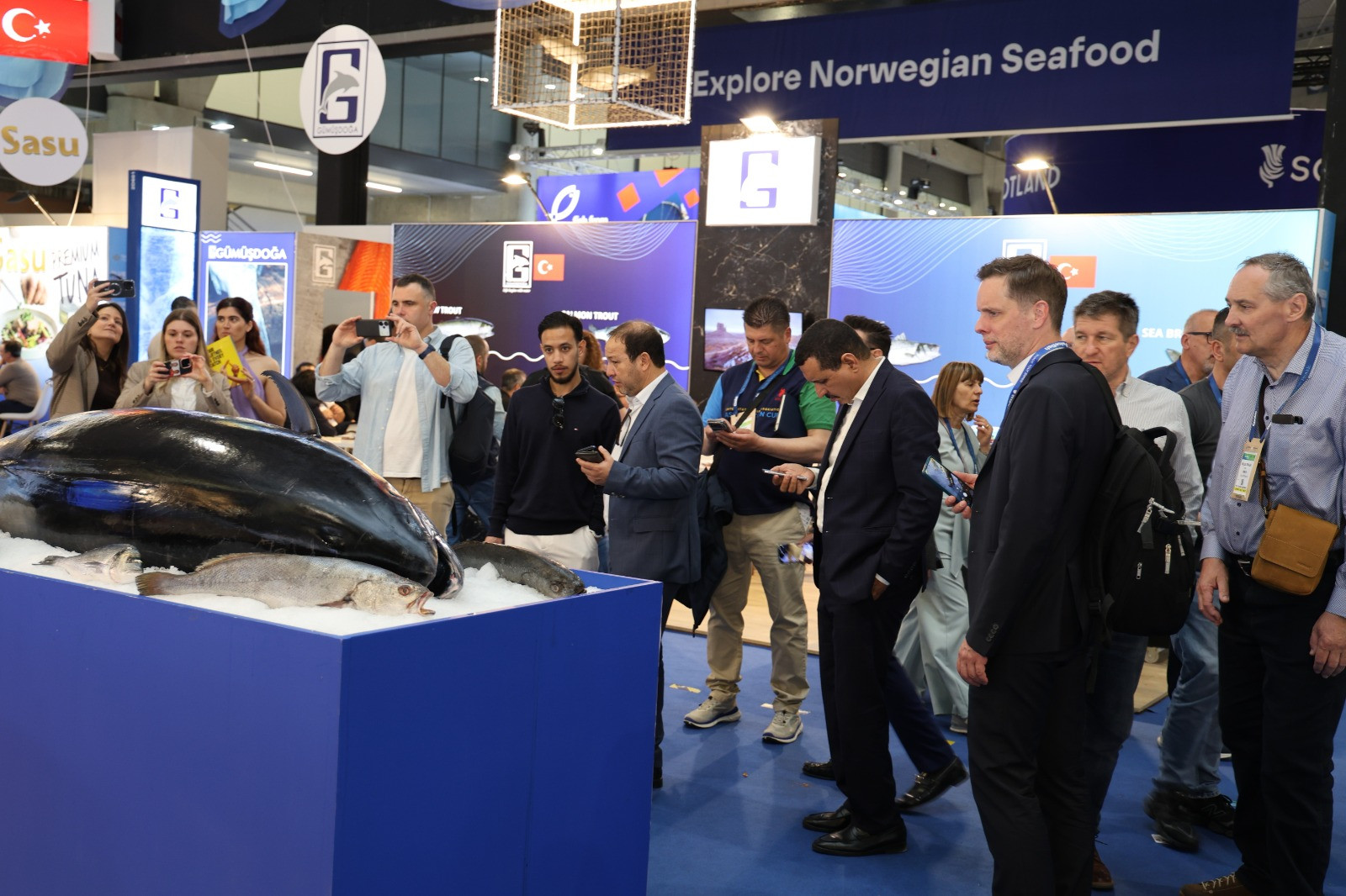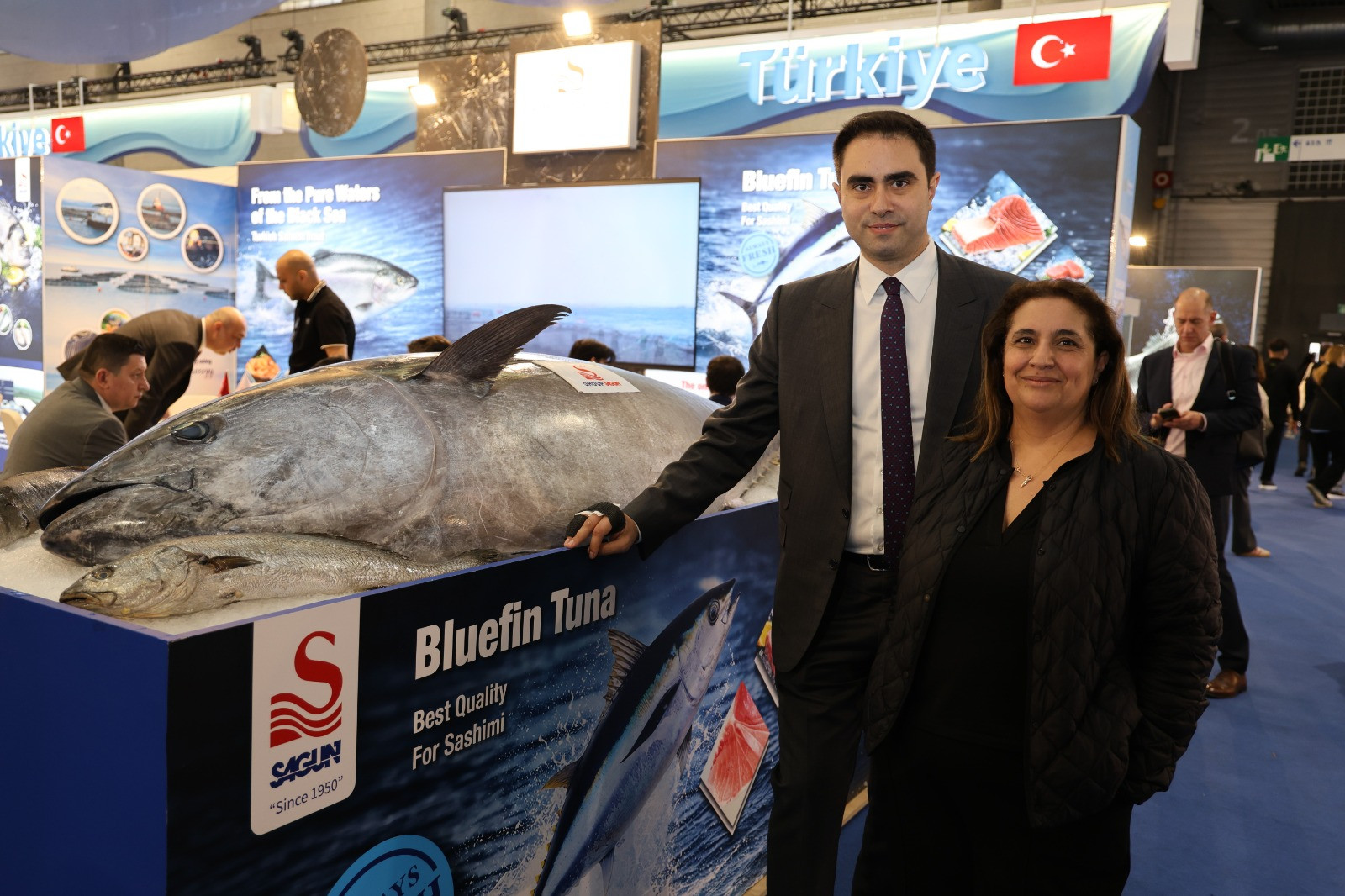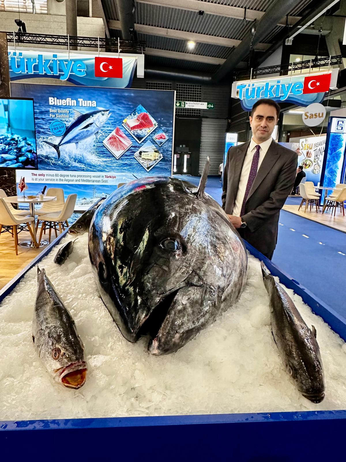 Toplamda beş büyük salona ayrılan fuarda tartışmasız en büyük ilgiyi Türkiye standı gördü. Zira 5 dev salona yayılan fuarı gezdim ve Türkiye standındaki ilginin benzerini göremedim. Bunun ana nedeni ise İstanbul Su Ürünleri ve Hayvansal Mamuller İhracatçıları Birliği (İSHİB) Başkan Yardımcısı Oğulcan Kemal Sagun’un şirketi Sagun Grup’un İzmir’den getirdiği 300 kilogramlık orkinos balığıydı.