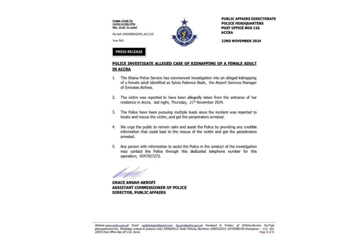Gana Polis Teşkilatı, Emirates Havayolları Havaalanı Hizmetleri Müdürü Sylvia Patience Baah'ın kaçırılması iddasıyla ilgili soruşturma başlattı.
