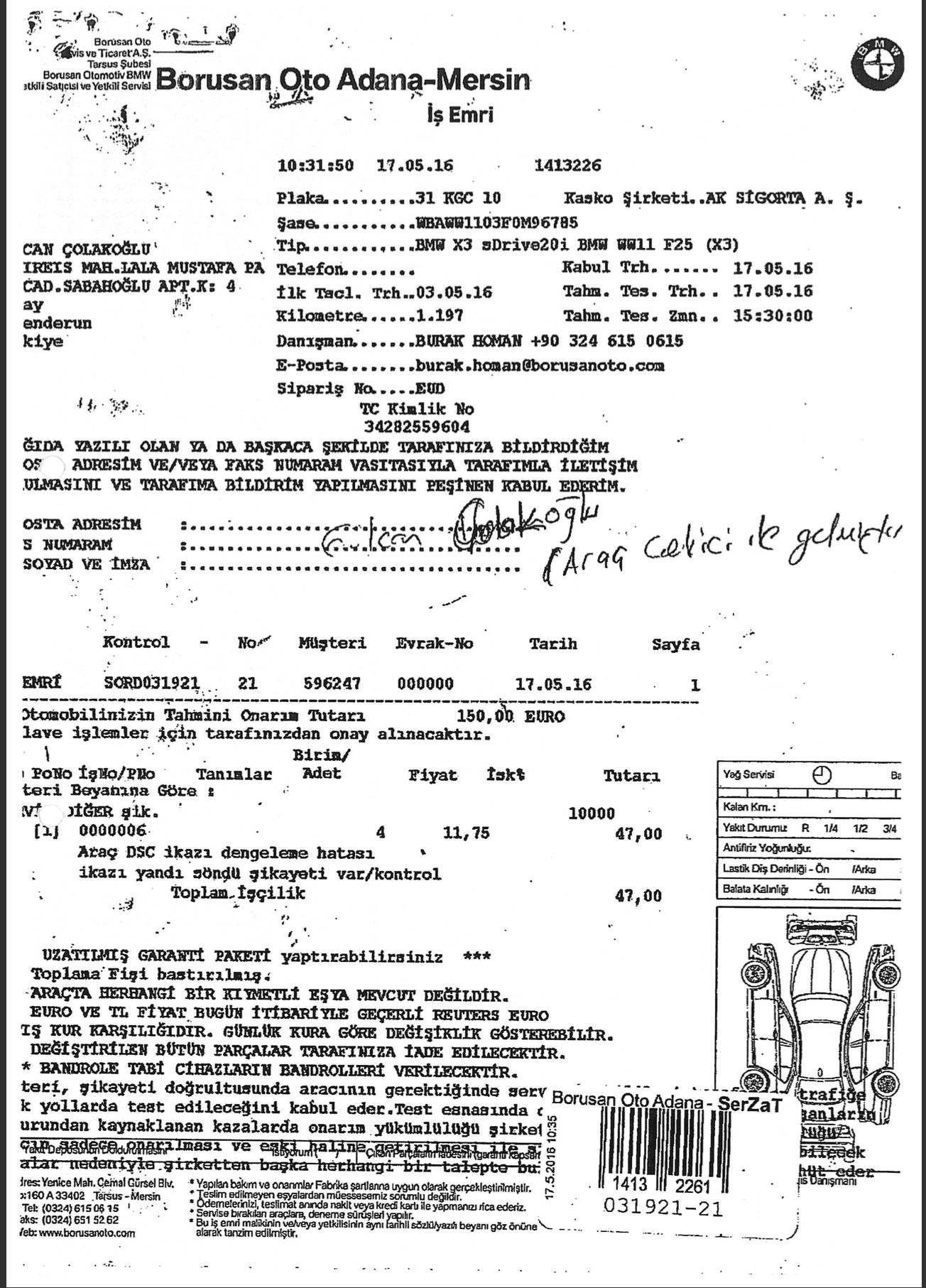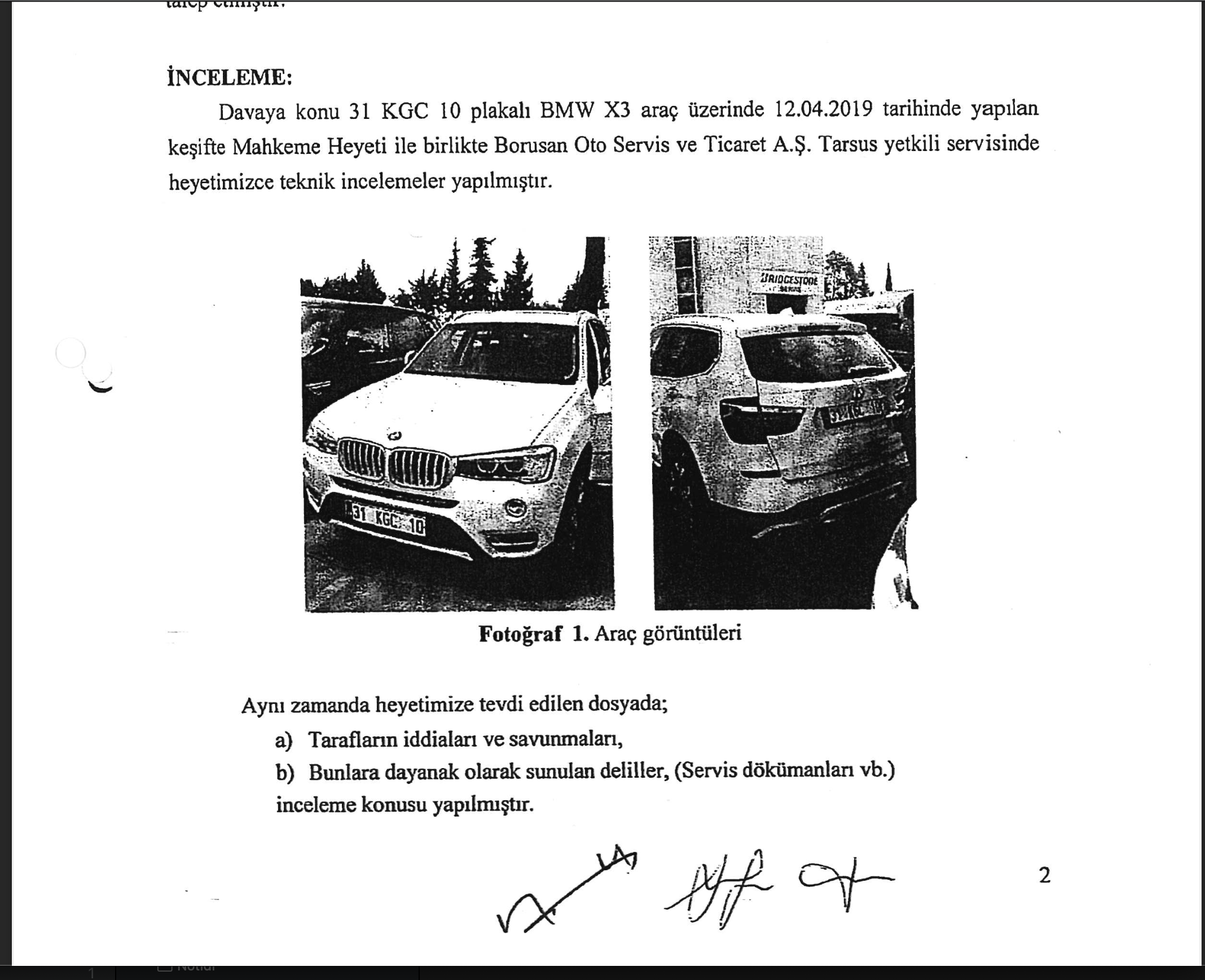 Davalı şirketin aracın nerede bulunduğuna dair mahkeme sorusuna karşılık 3 Ocak 2018’de verdiği yanıt, dava dosyasına girmişti. O belgede aracın halihazırda Borusan Oto Servis ve Ticaret AŞ’nin Adana şubesinde bulunan yetkili servisinde olduğu belirtilmişti.