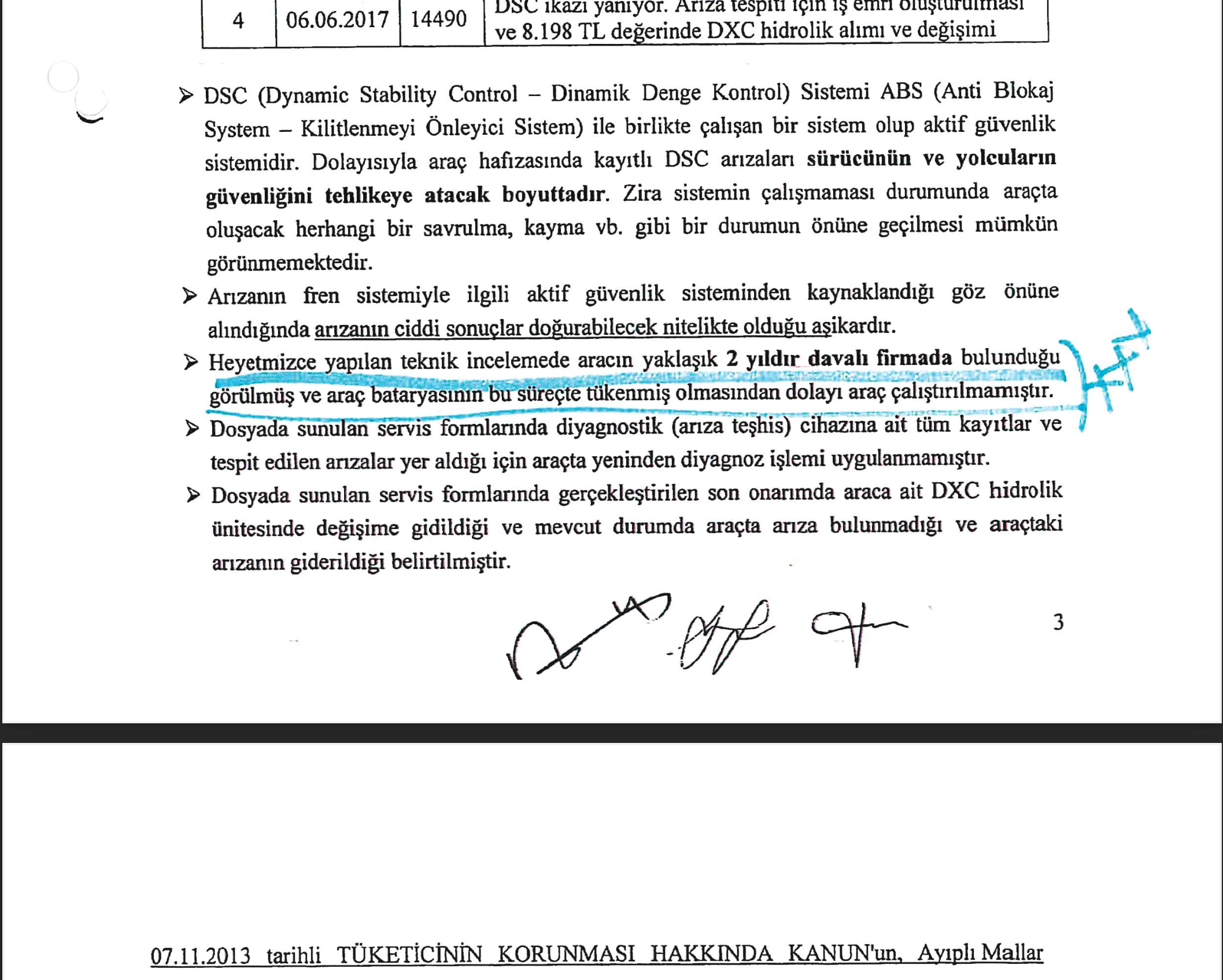 Oysa dava aşamasında tutanaklara; söz konusu aracın servise teslim edildiği, arıza giderilmesine rağmen tüketici tarafından kullanılmasının hayati tehlike barındırması nedeniyle geri alınmadığı ve serviste bekletildiği hususları yazılmıştı.