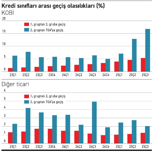 Aynı dönemde büyük işletmelerin yer aldığı diğer ticari kredilerde birinci çeyrekte ikinci gruptan tahsili gecikmiş alacağa geçiş olasılığı yüzde 2'nin üzerindeyken, ikinci çeyrekte yüzde 3'e yaklaştı ama üçüncü çeyrekte yeniden yüzde 2'ye geriledi. Tarihsel olarak bakıldığında KOBİ kredilerinde yakın izleme grubu olan ikinci gruptan tahsili gecikmiş alacak sınıflandırmasına geçiş oranı en yüksek seviyesine bu yıl üçüncü çeyrekte çıktı. KOBİ kredilerinin takibe düşme olasılıklarının yanı sıra canlı kredilerden yakın izlemeye düşme olasılığında da hızlanma oldu.