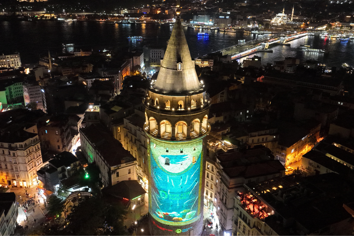 İstanbul'un simge yapılarından Galata Kulesi'ne, "Uluslararası Sıfır Atık Forumu" kapsamında sürdürülebilir bir geleceğe dikkati çekmek amacıyla çevre temalı görseller yansıtıldı.