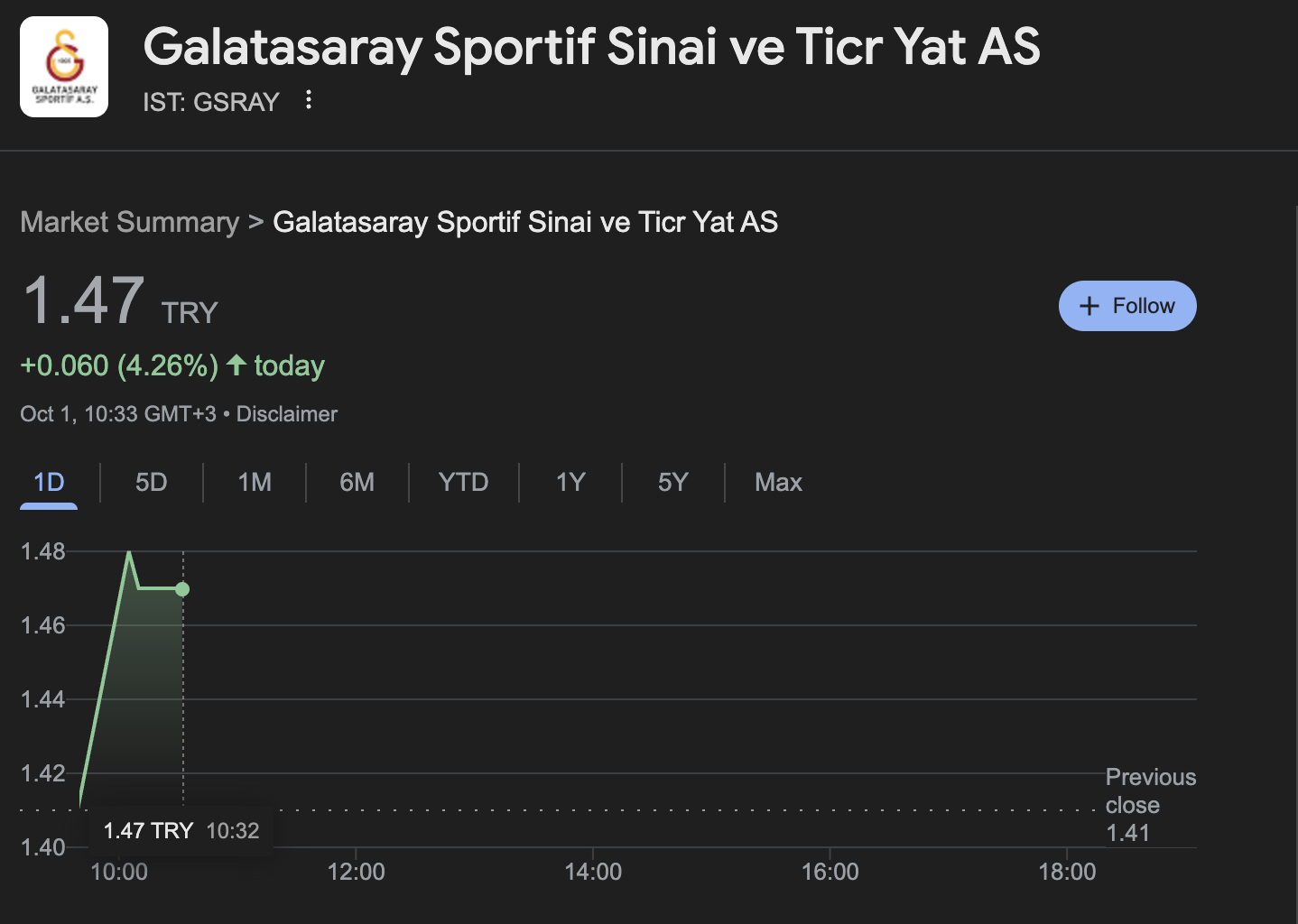 Borsa İstabul'da işlem gören Galatasaray hisseleri güne yüzde 5'e yakın yükselişle başladı.