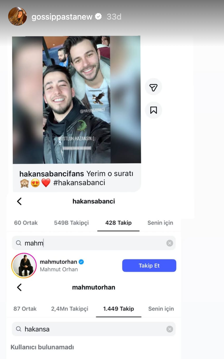 Gündeme gelen yeni aşk iddiası ardından Mahmut Orhan, Hakan Sabancı'yı sosyal medya hesabından sildi. Hakan Sabancı, Mahmut Orhan'ı takip etmeye devam ediyor.
