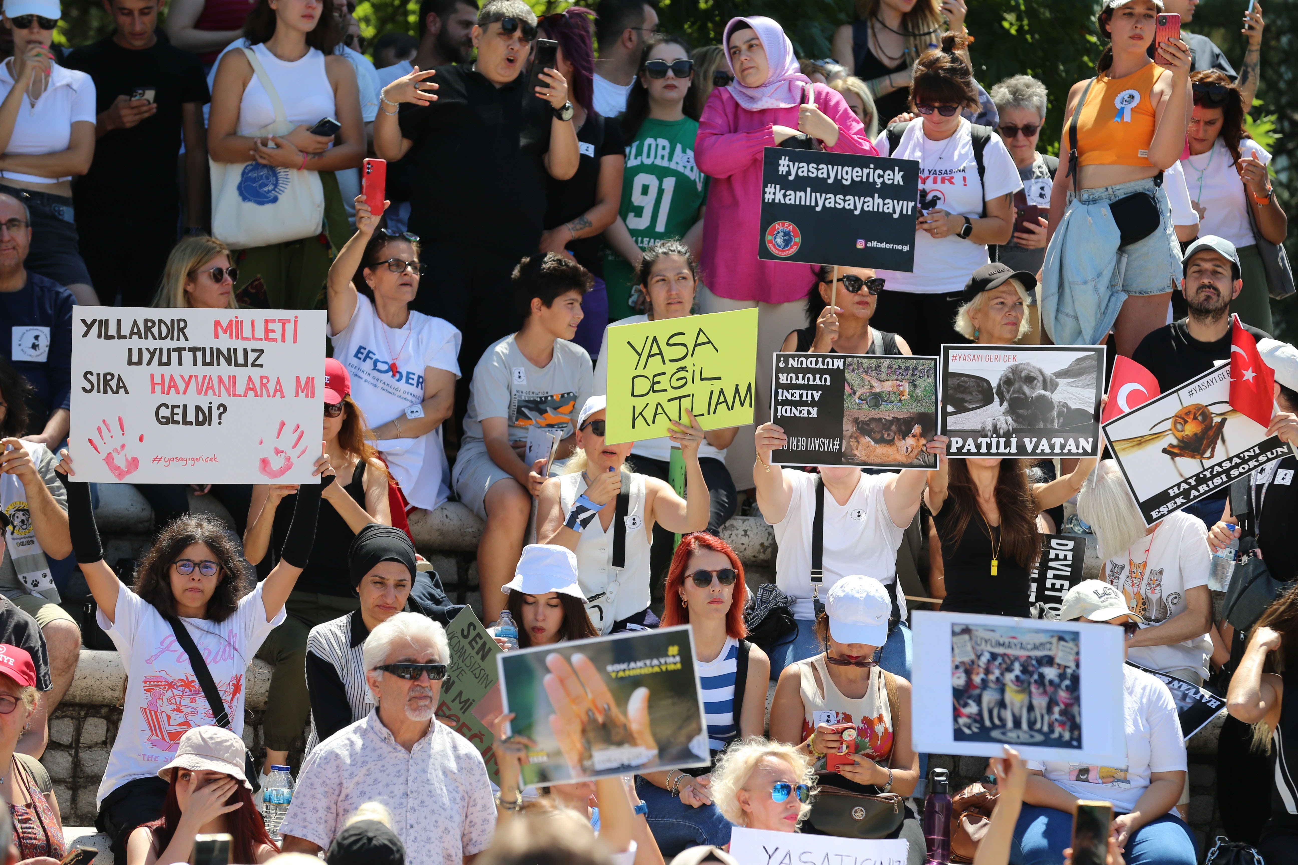 Sokak hayvanlarının uyutulmasını da içeren yasa teklifi TBMM Genel Kurulu’na geldi. Yasa görüşmeleri sırasında TBMM’ye ziyaretçi alınması yasaklanırken, Türkiye’nin dört bir yanından Ankara’ya gelen hayvan severler de Anıtpark’ta buluşarak yasayı protesto etti. Hayvanseverler ‘Susma haykır, katliama hayır’, ‘Çek, çek, çek yasayı çek. Hayvanları değil tecavüzcüleri uyutun' diye slogan attı ve pankart açtı