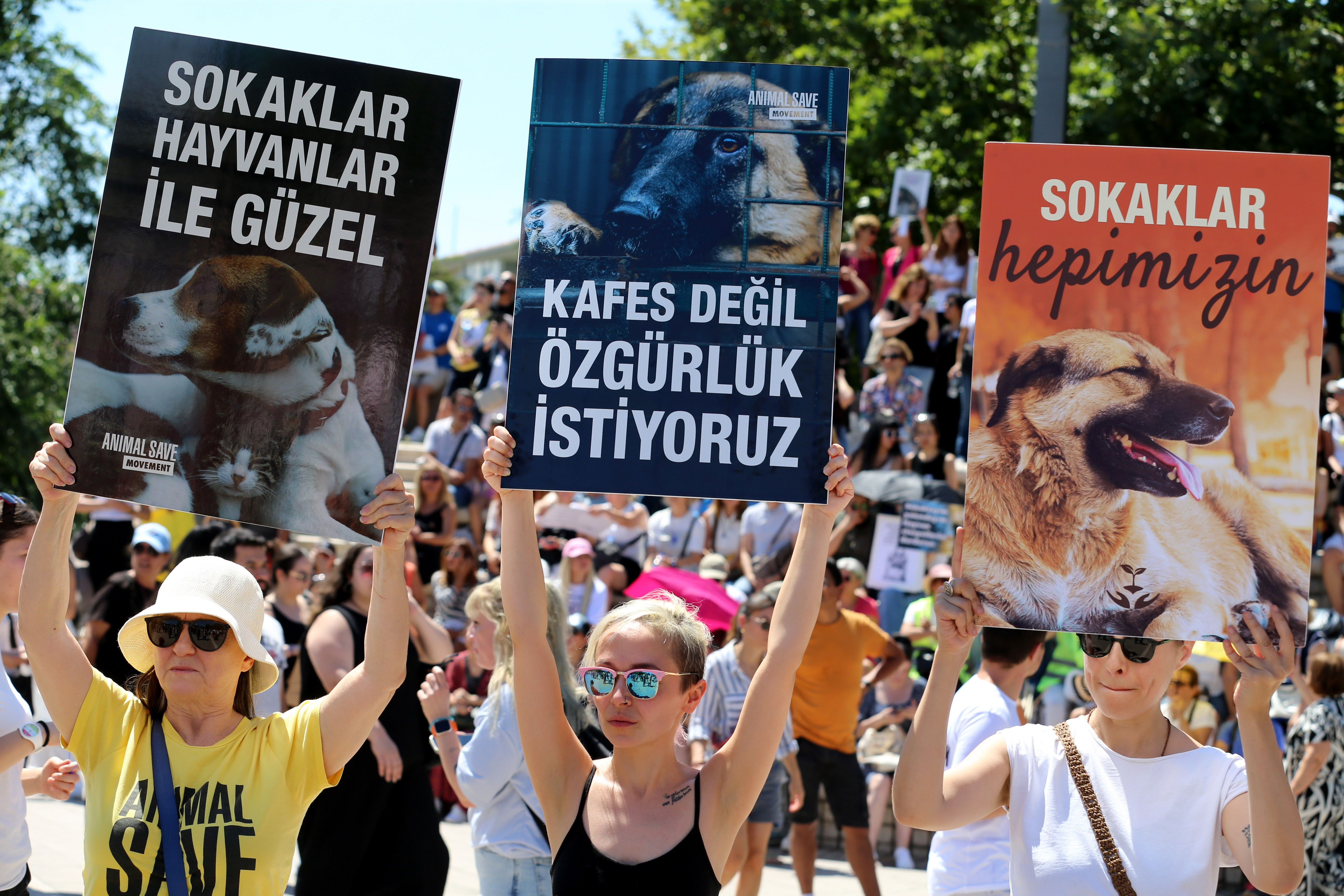 Pankartlarda, 'Neyi kurtaracağımızı şaşırdık. Hayvanları mı, çocukları mı, kadınları mı?", 'Mahkumların masum olduğu tek hapishane barınaklardır', "Kula bela gelmez hak yazmadıkça, hak bela yazmaz kul azmadıkça" şeklinde pankartlar açıldı.