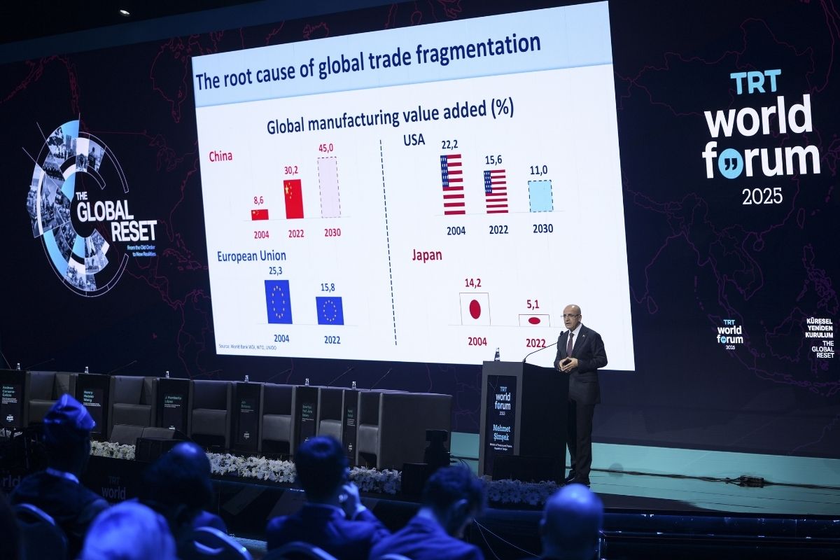 Bundan 20 yıl önce Çin'in küresel imalattaki payının yüzde 9'un altında olduğunu, bugün söz konusu oranın yüzde 30'un üzerine çıktığını kaydeden Şimşek, "Aynı eğilim devam ederse bu pay yüzde 45'e bile çıkabilir. Kim pay kaybetti? Genel olarak Batı. ABD'nin küresel imalattaki payı yüzde 22'den yüzde 11'e geriledi. Avrupa Birliği yaklaşık 10 puan kaybetti. Japonya da öyle. İşte korumacılığın asıl nedeni bu" diye konuştu.