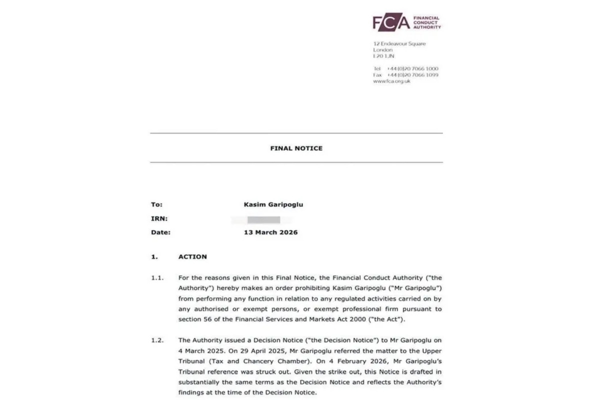 İngiltere Finansal Denetleme Kurumu, Kasım Garipoğlu’na çalışma yasağı getirdi