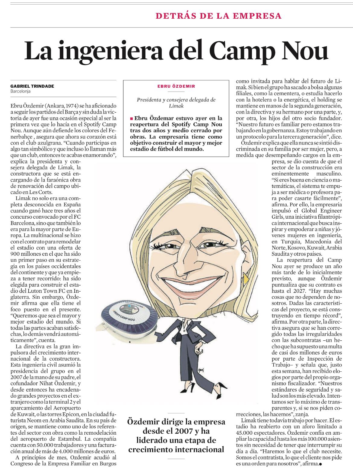 İspanya’nın köklü gazetesi La Vanguardia, Gabriel Trindade imzalı kapsamlı bir portreyle Barcelona'nın stadyumu Camp Nou'yu yeniden inşa eden Limak Holding Yönetim Kurulu Başkanı ve CEO’su Ebru Özdemir’i okuyucularına tanıttı. Haberin merkezinde ise hem dev stadyum projesi hem de Türk bir iş insanının Barcelona tutkusuna dönüşen yolculuğu vardı.