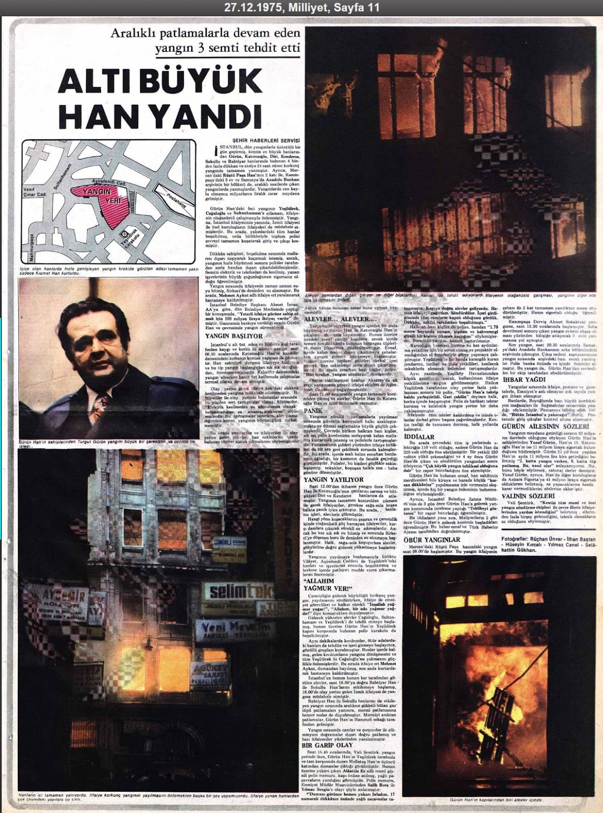 Eminönü’nün kalbinde, Yeni Camii’nin karşısında yaklaşık 500'den fazla dükkanı bulunan Gürün Han'da akşam saatlerinde büyük bir yangın çıktı. Alevler kısa sürede hanın ahşap üst katlarına yayıldı. Büyüyen yangında Katırcıoğlu Han, Diri Han, Kenderos Han, Sokullu ve Bahtiyar Hanları da kül oldu.