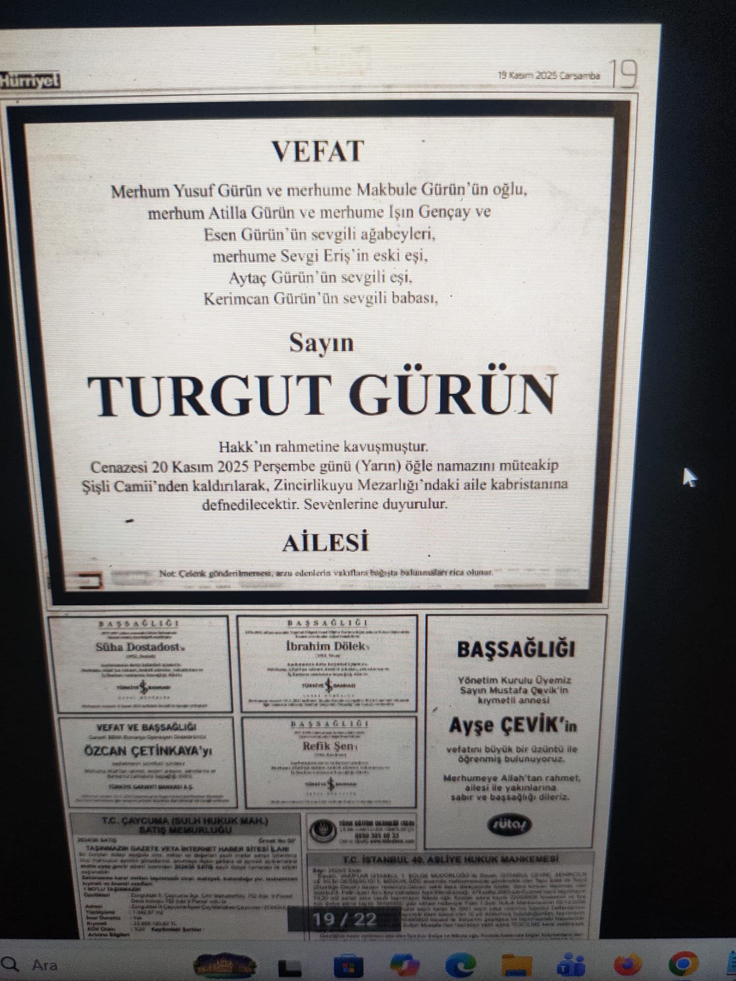 İşte bugün bir gazetede gördüğüm yarım sayfalık ilan o Gürün Han'ın sahibi Yılmaz Gürün'ün oğlu Turgut Gürün'ün ölüm ilanıydı...