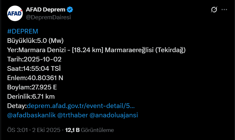 AFAD'da yer alan bilgilere göre, depremin merkez üssü, Marmaraereğlisi’ne yaklaşık 18 kilometre mesafede kaydeildi.