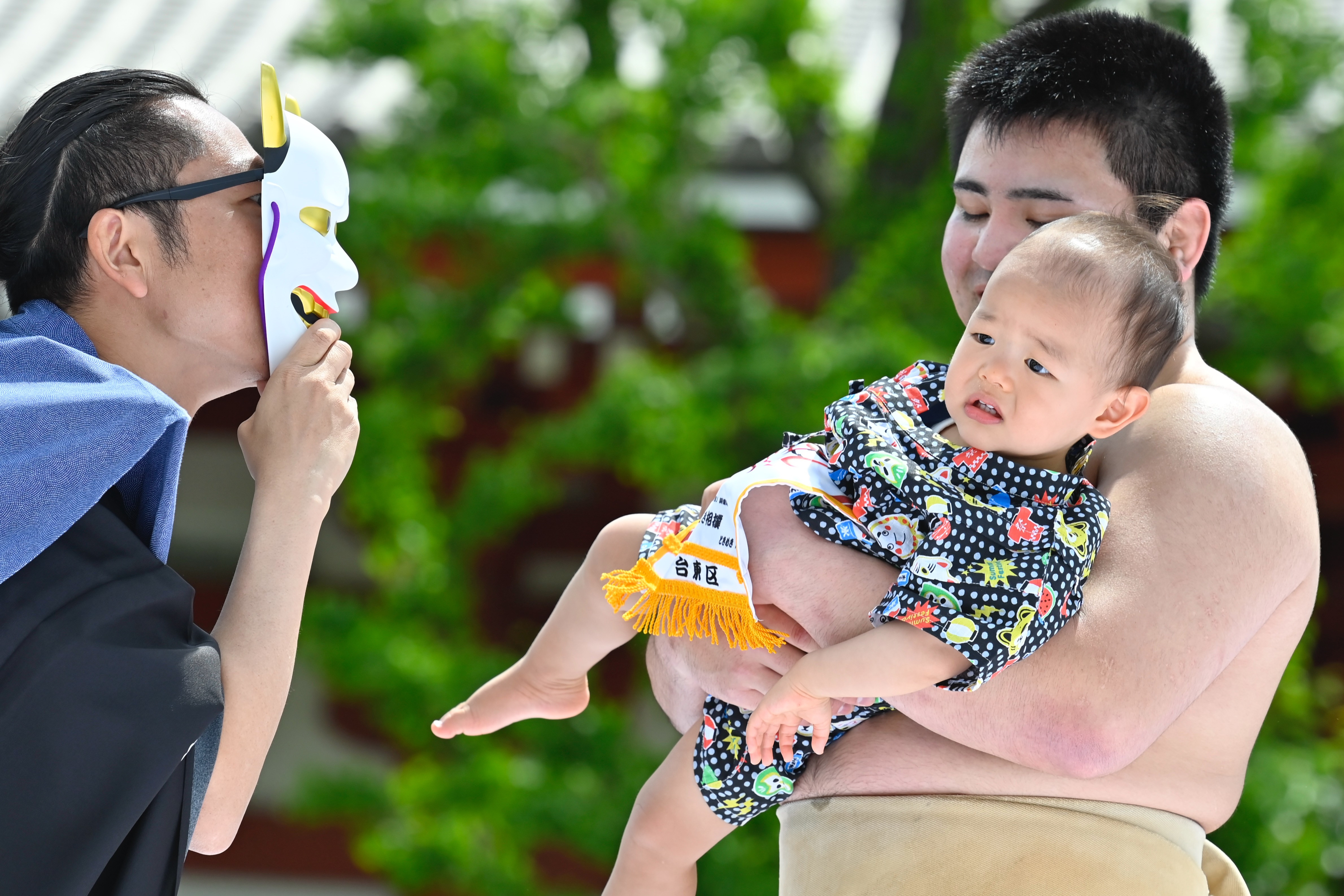 Japonya'nın başkenti Tokyo'da bulunan Sensoji tapınağında düzenlenen "Nakizumo" veya ağlayan sumo bebek yarışması olarak bilinen geleneksel festivalde sumo ringine çıkan bebekler "Gyoji" adı verilen hakemler tarafından maskeyle korkutulup ağlatılıyor.