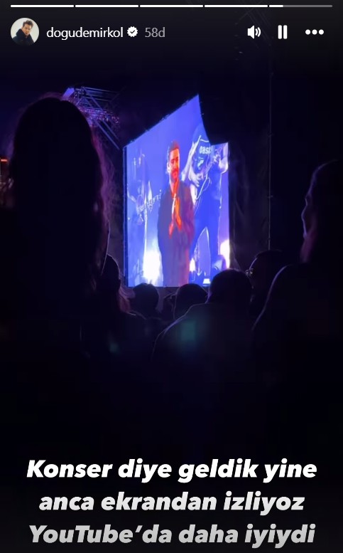 Doğu Demirkol da hikaye paylaşımında "Konser diye geldik yine ancak ekrandan izliyoruz. Youtube'da daha iyiydi" şeklinde yorum yaptı.