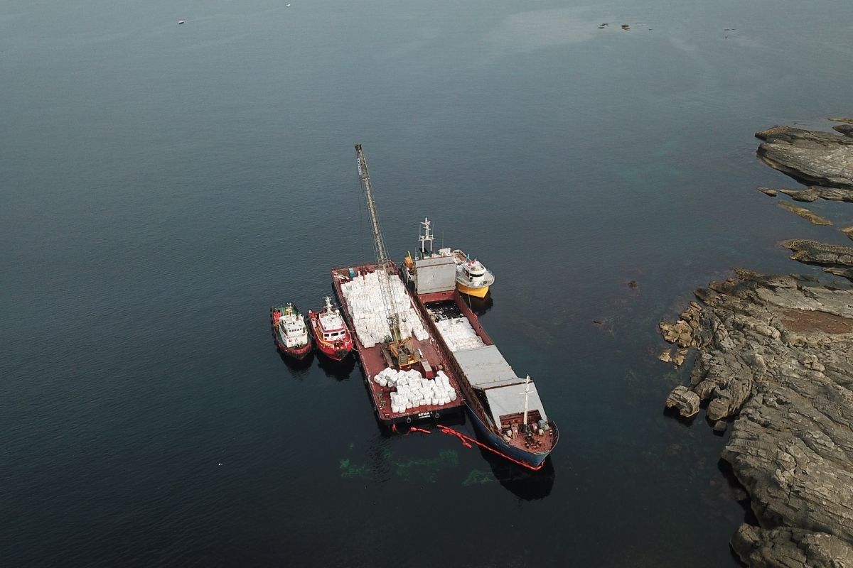 Geminin etrafına bariyer çekilerek olası yakıt sızıntısına karşı önlem alınırken, gemide bulunan 2 bin 135 ton alçının tahliyesine başlandı.