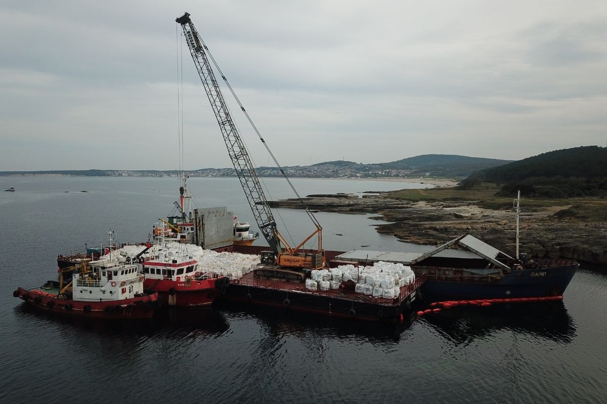 Bu kapsamda bölgeye gelen "SEMA 1" adlı geminin üzerindeki vinç yardımıyla alınan yükler, limana götürülmek üzere başka gemilere sevk ediliyor.