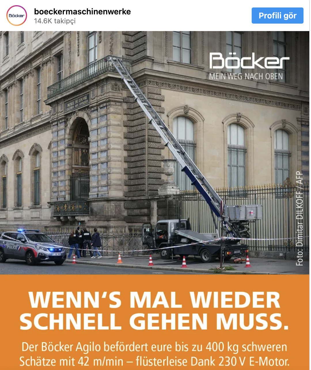 Paris’teki ünlü Louvre Müzesi’nde meydana gelen soygunda, değerli mücevherler çalınırken kullanılan kaldırma cihazının üreticisi olan Alman şirket Boecker Maschinenwerke, tarihi olayı kendi reklamını yapmak için kullandı.