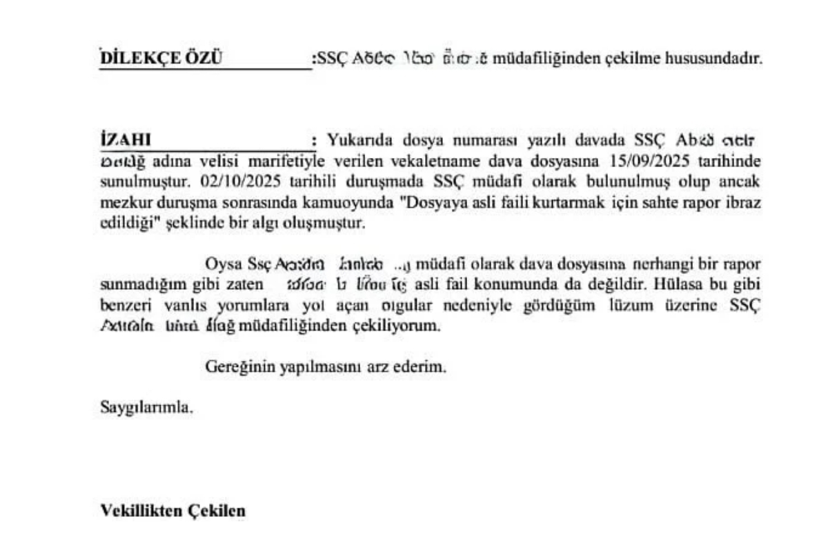 Avukat çekilme dilekçesinde, "yanlış yorumlara yol açan olgular nedeniyle gördüğüm lüzum üzerine müdafiliğinden çekiliyorum" ifadelerini kullandı.
