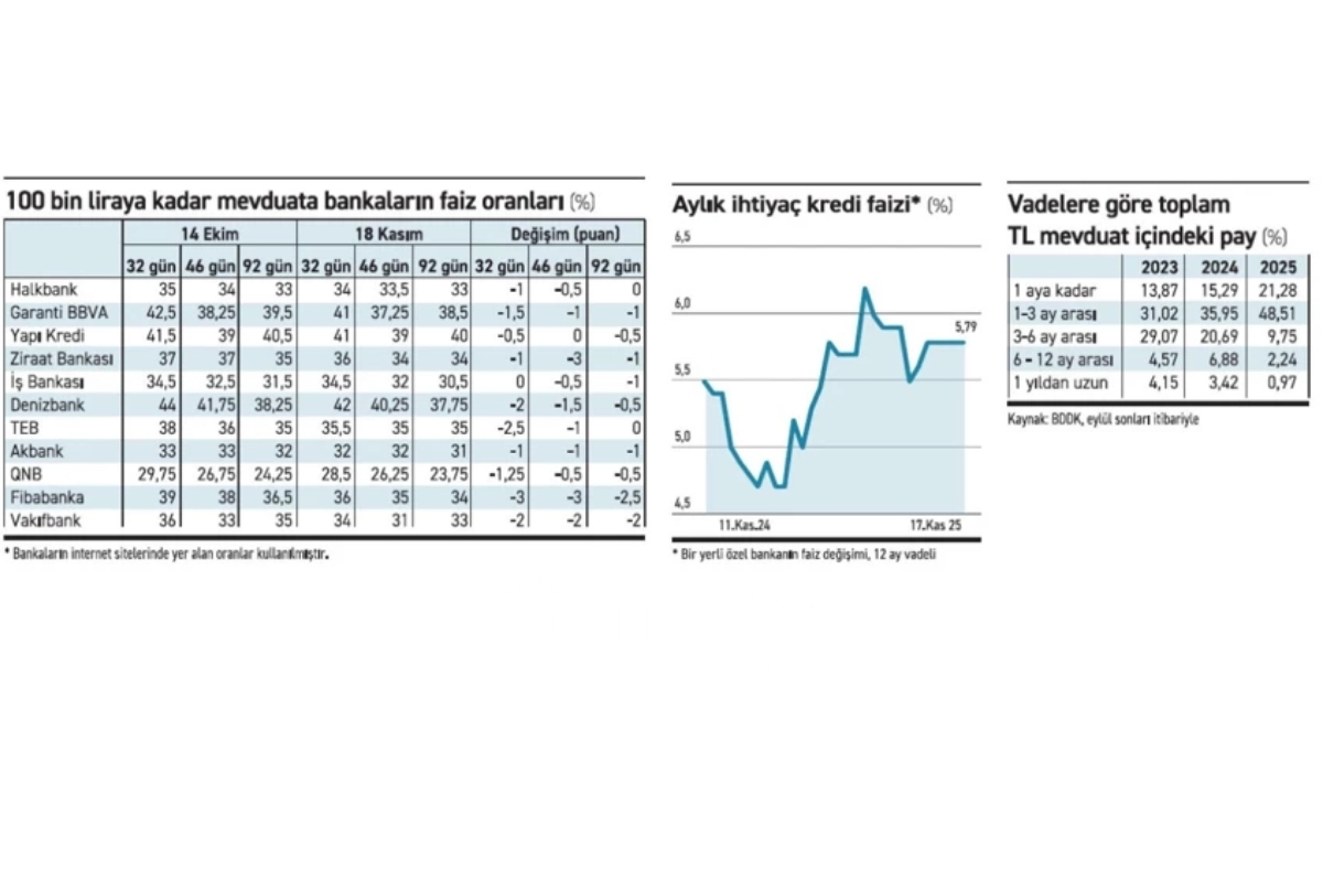Takip edilen bankalarda 14 Ekim’de 32 güne kadar vadede en yüksek faiz oranı yüzde 44’ü buluyordu, 1 ayın ve 100 baz puanlık indirimin ardından şu an bankaların standart TL mevduatta 32 gün vadede mevduat faiz oranı en yüksek yüzde 42 seviyesinde. 2 puanlık düşüş yaşandı. Yeni müşteriye sunulan ‘hoş geldin faiz’ oranları ise yüzde 46,5’e kadar çıkıyor. Yine bir ay önce bu oranlar yüzde 49’un üzerinde seyrediyordu. Bankalarda ortalama 1-1.5 puan arasında 32 güne kadar vadede TL mevduat faiz oranlarında son 1 ayda düşüş yaşandı. Yılın son Merkez Bankası Para Politikası Kurulu toplantısı öncesinde 32 gün vadede politika faizinden daha yüksek faiz oranları sunulabiliyor. Ancak hem aralık toplantısı beklentileri hem de 2026 için politika faiz indirimlerinin devam edecek olması mevduat faiz oranlarında da fiyatlandı. Bankacılık sektöründe 46 gün vadede en yüksek faiz oranı yüzde 40,25 ile politika faizinin üzerinde olsa da bir ay öncesine göre 1.5 puanlık düşüş yaşandığını gösteriyor. Çoğu bankada ise 46 gün yüzde 39,5 olan politika faizinin altında mevduat faizi oranları bulunuyor. Bazı bankalarda bu oran yüzde 26,25’e kadar gerilese de ortalama yüzde 34 seviyesinde 46 güne kadar vadede mevduat faiz oranı olduğu görülüyor. 92 gün ise bankacılık sektörünün en düşük mevduat faiz oranlarını verdiği vade. Merkez Bankası’ndan indirim beklentileri olduğu için bu durum normal. 11 Aralık’taki Para Politikası Kurulu toplantısı sonrası yeni yılın ilk PPK’sı 22 Ocak’ta yapılacak. 92 gün vadede iki PPK toplantısı ve iki olası faiz indirimi yaşanmasını göz önünde tutan bankacılık sektörü riske girmiyor ve 92 gün vadede mevduat faiz oranlarını çoğunlukla yüzde 39,5’in altında hatta yüzde 30’a yakın belirliyor. Bu vadede en yüksek faiz yüzde 40 seviyesinde. Son bir ayda 92 gün vadede 100 bin liraya kadar mevduatta faiz oranlarındaki gerileme de ortalama 1 puan seviyesinde gerçekleşti.
