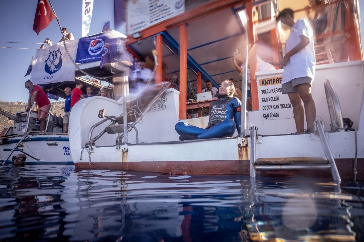 Milli sporcu Şahika Ercümen, Gazze halkına dayanışma mesajı vermek amacıyla Antalya'nın Kaş ilçesinde değişken ağırlık paletsiz dalış kategorisinde kendisine ait dünya rekorunu geliştirdi.