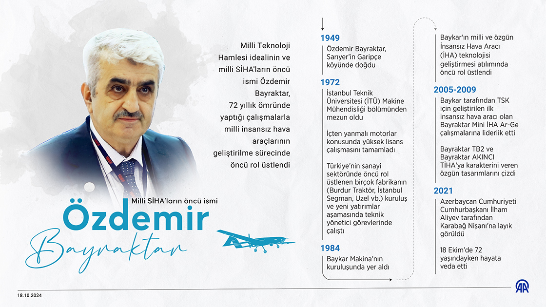 18 Ekim 2021'de hayata veda eden, girişimci, yüksek mühendis ve sanayici Özdemir Bayraktar, hayatını, Türkiye'nin tam bağımsızlığı için son 20 yılını iş yerinde yaşayarak, gerek arazide gerek tezgahı başında Milli SİHA'lara vakfetti.