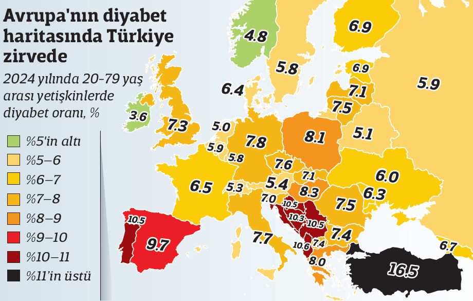 Uluslararası Diyabet Federasyonu’nun Diyabet Atlası 2025 raporuna göre Türkiye, Avrupa bölgesindeki 60 ülke içinde hem diyabetli sayısı hem de nüfusa oranda en kötü durumdaki ülke