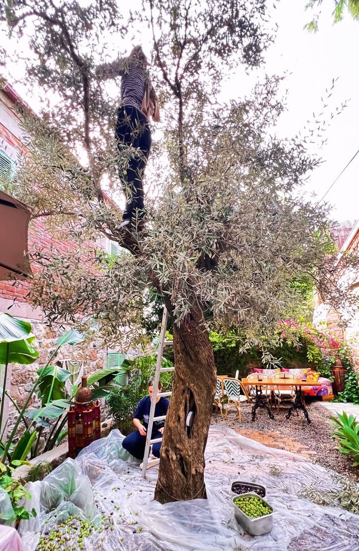 Oyuncu Burcu Biricik Ayvalık'ta bulunan otelinin bahçesindeki zeytinleri topladı