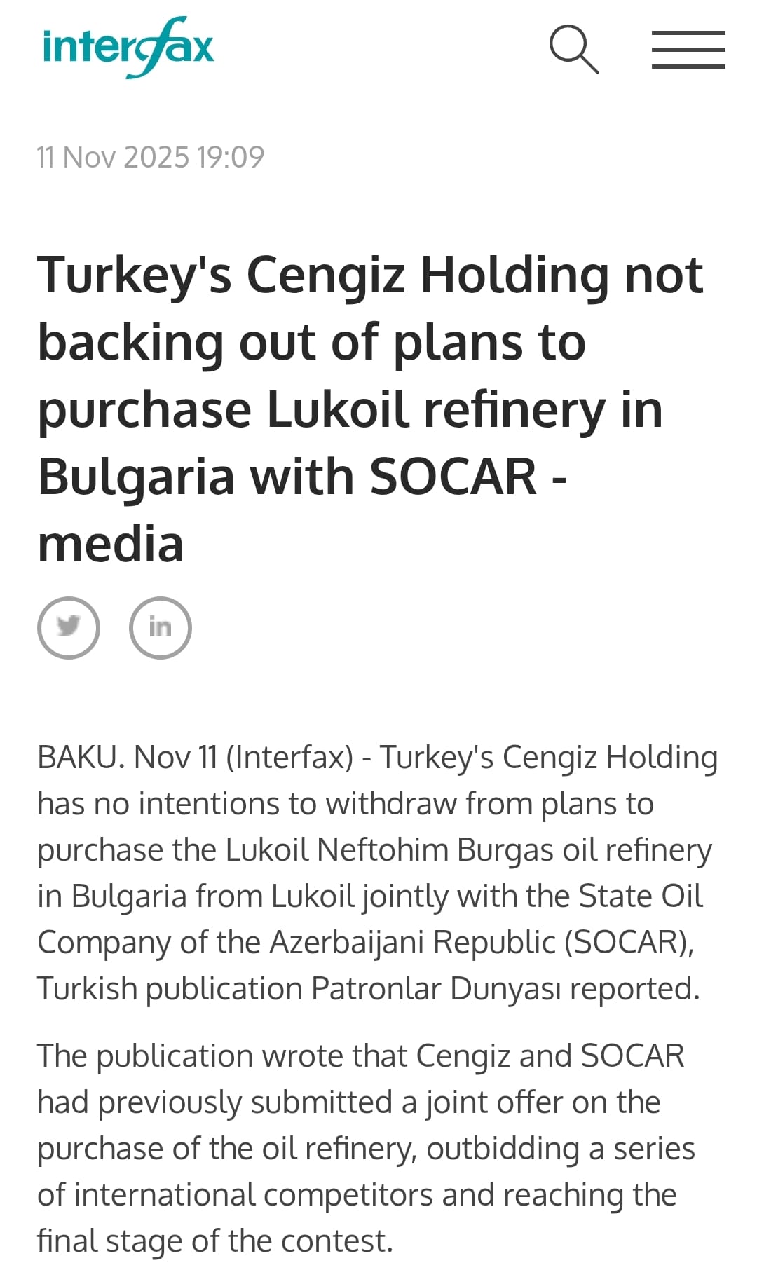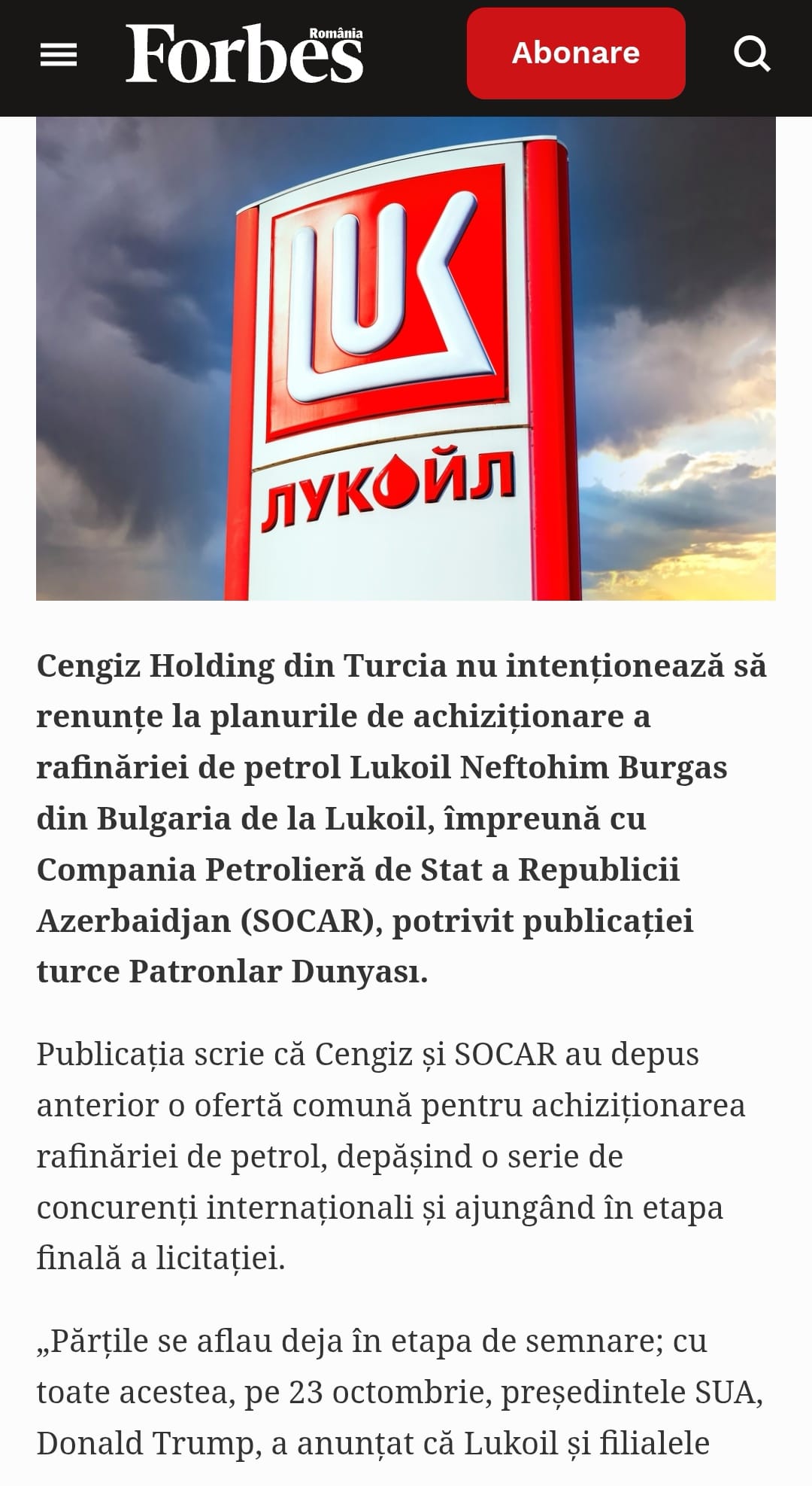 Dünyanın en önemli ekonomi yayınlarından Forbes’un Romanya edisyonu ise haberi Patronlar Dünyası’ndan aldığını belirterek, bilgileri okuyucularına “Türkiye’nin Cengiz Holding’i, SOCAR ile Bulgaristan’daki Lukoil rafinerisini satın alma planından vazgeçmiyor” başlığıyla duyurdu.