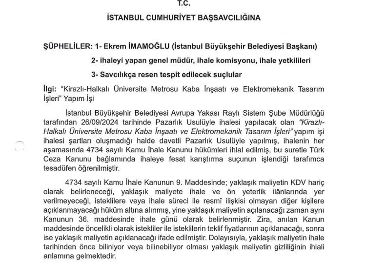 İBB Başkanı Ekrem İmamoğlu, ekibi ve ilgililer hakkında ihaleye fesat karıştırmak ve kamuyu zarara uğratmak suçlamasıyla suç duyurusunda bulunuldu. Suç duyurusu üzerine söz konusu ihaleye ilişkin iddialar ve ilgililer hakkında İstanbul Cumhuriyet Başsavcılığı'nca inceleme başlatıldığı öğrenildi.