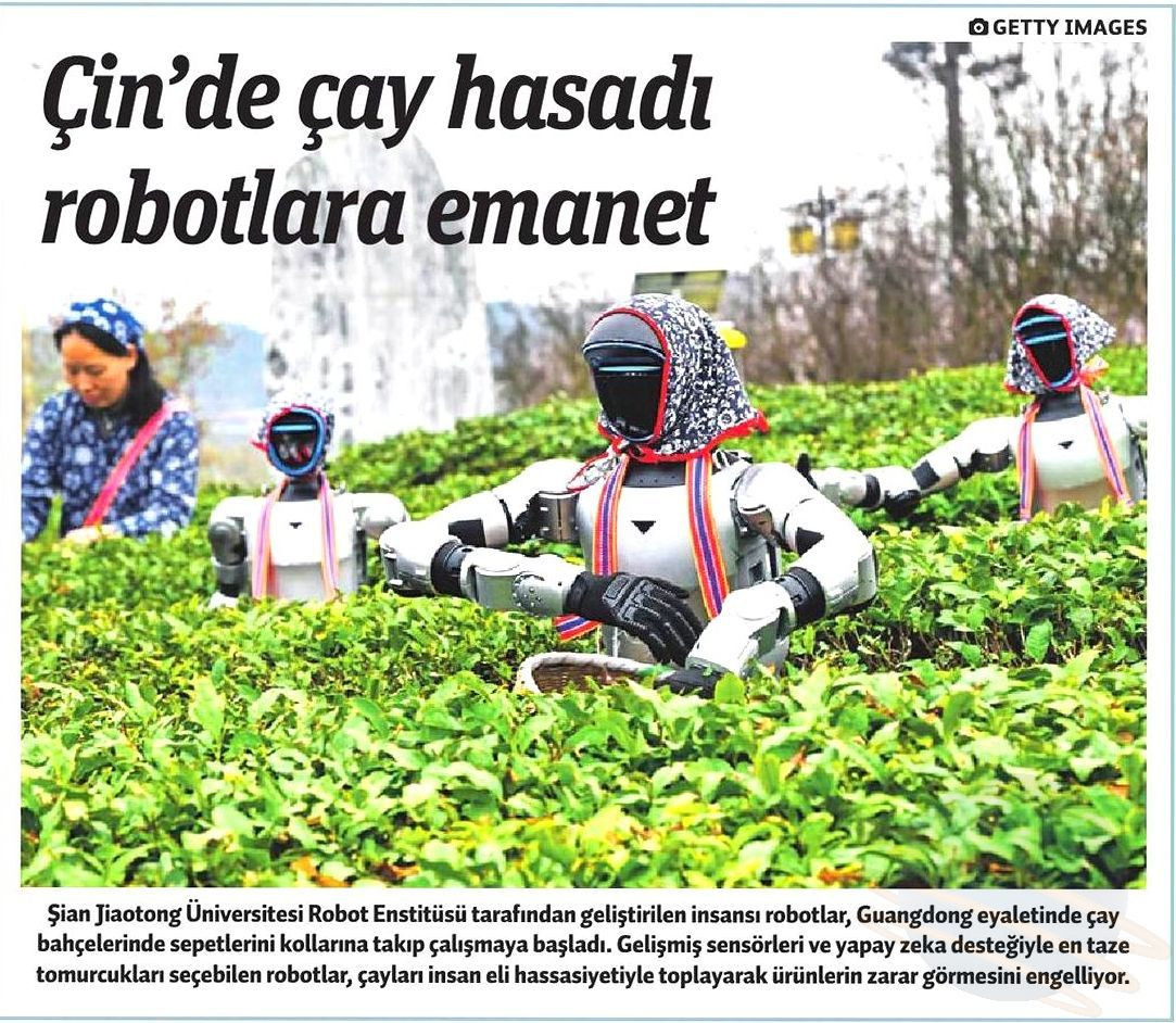 "Çin'de çay hasadı robotlara emanet" başlığının altındaki fotoğrafta çay toplayan robotların fotoğrafı vardı. Başlarında yöresel örtüler, ellerinde sepetler...