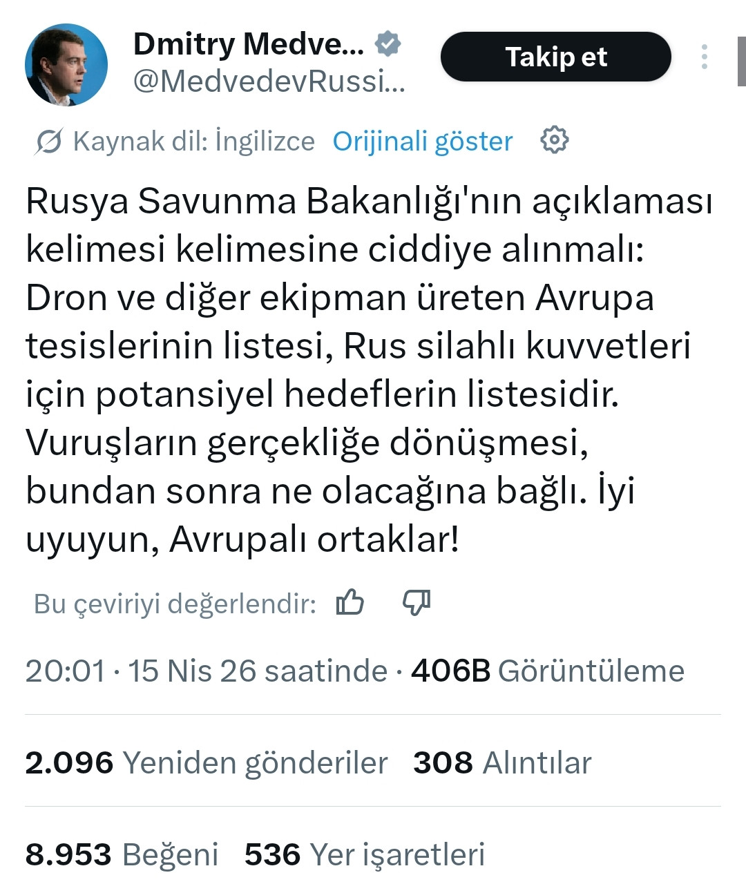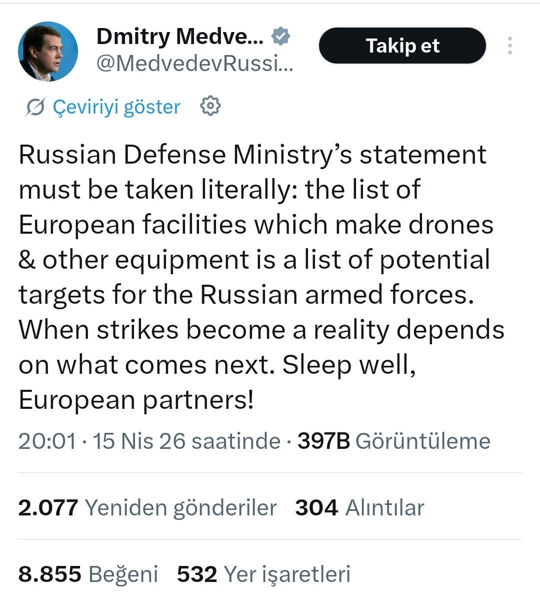 Açıklamada ayrıca, Kiev yönetiminin dile getirdiği ve Avrupa üretimi olup “Ukrayna’ya ait” olarak sunulan İHA’larla Rusya’ya yönelik saldırı senaryolarının hayata geçirilmesinin “öngörülemez sonuçlara” yol açabileceği ifade edildi. Ancak asıl açıklama ise eski Rusya Devlet Başkanı ve Rusya Güvenlik Konseyi Başkan Yardımcısı Dmitriy Medvedev’den geldi. Medvedev sosyal medya ağı X’ten yaptığı açıklamada, bu şirketlerin bir hedef olduğunu söyledi. Medvedev, “Rusya Savunma Bakanlığı'nın açıklaması kelimesi kelimesine ciddiye alınmalı: Dron ve diğer ekipman üreten Avrupa tesislerinin listesi, Rus silahlı kuvvetleri için potansiyel hedeflerin listesidir. Vuruşların gerçekliğe dönüşmesi, bundan sonra ne olacağına bağlı. İyi uyuyun, Avrupalı ortaklar!” diye yazdı.