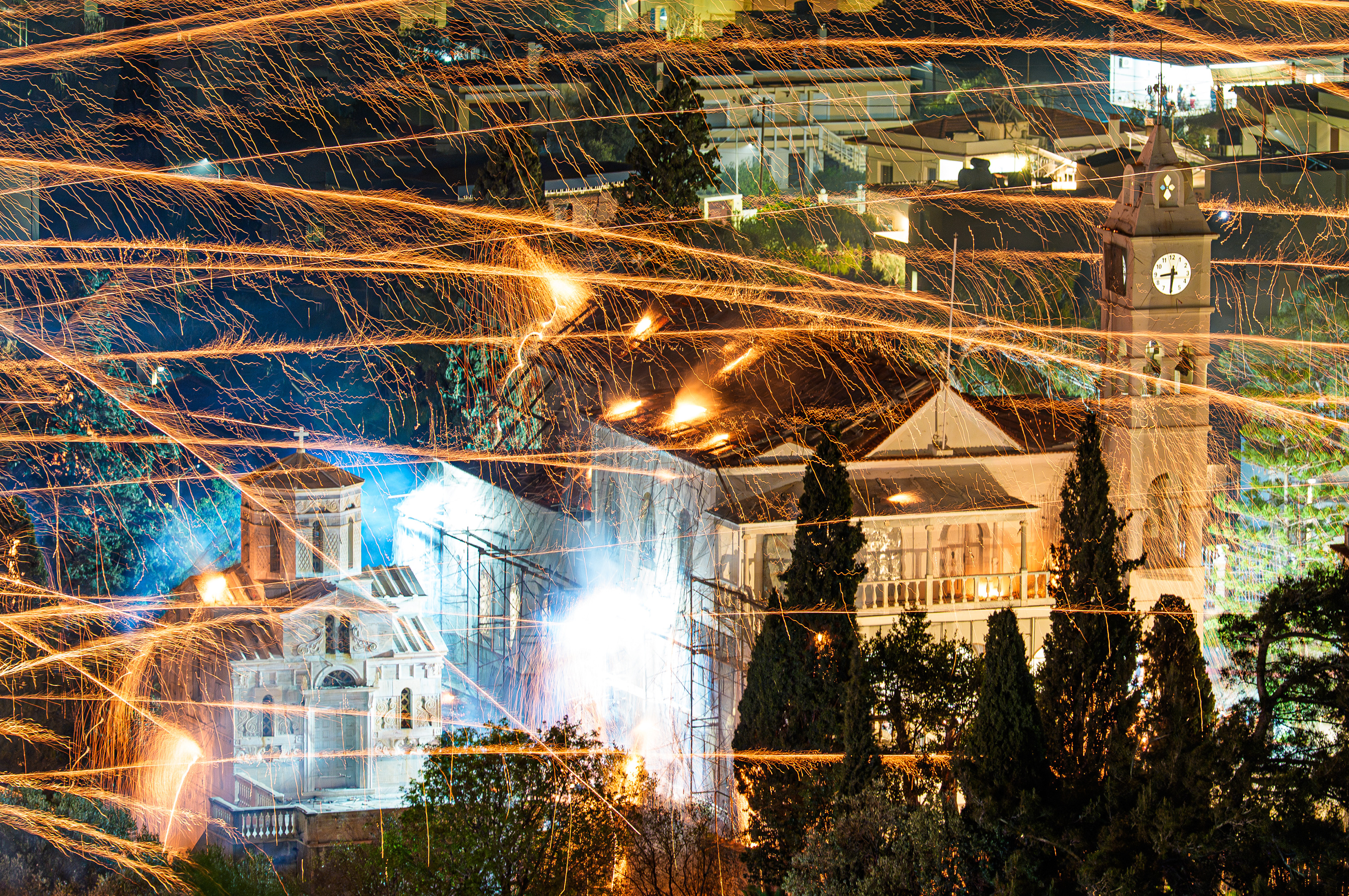 Hristiyanların en eski ve en önemli bayramı olarak kabul edilen gecede, adanın Vrondados bölgesindeki Ayios Markos (Saint Marc) ve Panagia Erithiani kiliselerinin cemaatleri, gelenek gereği el yapımı roketleriyle diğer kilisenin çan kulelerini vurmaya çalıştı.