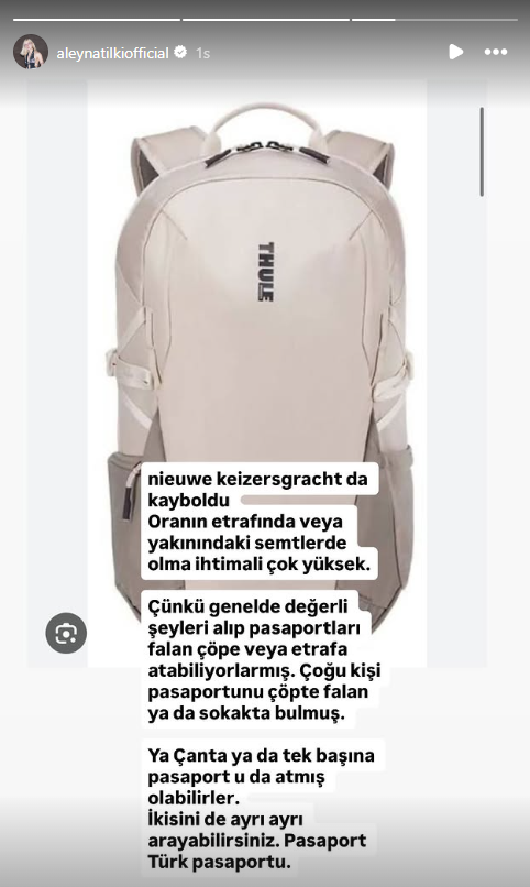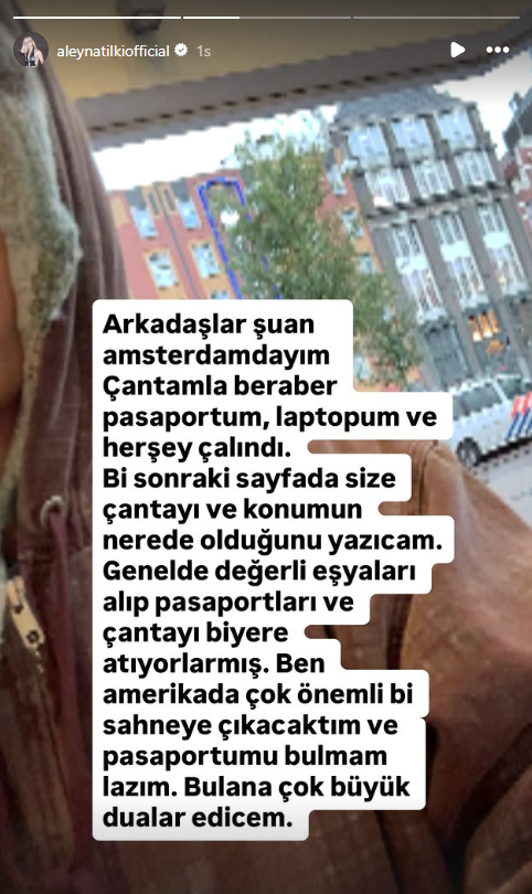 Şarkıcı Aleyna Tilki, sosyal medya hesabından yaptığı paylaşımla, Amsterdam'da çantasının çalındığını duyurdu.