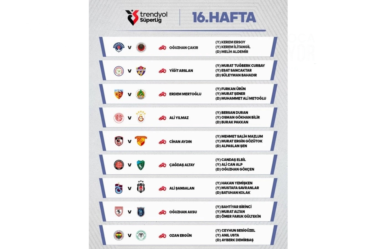 Trendyol Süper Lig'de 16. haftanın hakemleri belli oldu. Trabzonspor'un Beşiktaş'ı ağırlayacağı haftanın derbisinde