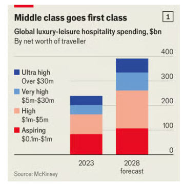 Ancak varlıklı kesim lüks seyahatlere para harcamaya devam ediyor. Lüks oteller, birinci sınıf uçak biletleri ve benzersiz deneyimler. Bir diğer danışmanlık şirketi McKinsey'e göre, lüks konaklamaya yapılan küresel harcamalar 2028'de 390 milyar doları aşacak.