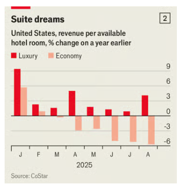 Analistler, Amerika'daki sıkı göçmenlik kuralları, ticaret savaşları ve jeopolitik dalgalanmaların tüketicileri tedirgin etmesiyle 2025'in seyahat sektörü için kötü bir yıl olmasını bekliyordu. Ancak lüks seyahat edenler, pazarı destekledi. Emlak verisi şirketi CoStar'a göre, mevcut lüks otel odası başına düşen gelir, bu yıl her ay 2024'e göre daha yüksekti; daha ucuz odalar içinse çoğunlukla düşüş yaşandı.